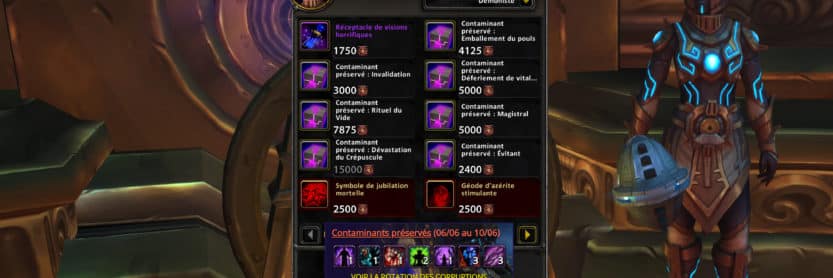 Depuis la mise à jour du mercredi 20 mai, les effets de corruption sur l'équipement peuvent être achetés sous forme de contaminants préservés auprès de D.A.M.E. à la chambre du Cœur contre la monnaie d'échange des échos de Ny'alotha. La mise à jour 8.3 a intégré 52 effets de corruption différents sur l'équipement déclinés en 1 à 3 rangs. Ces contaminants préservés sont proposés sous forme de rotation avec une liste de 6 à 7 corruptions à chaque fois que l'assaut mineur en Uldum ou au Val de l'éternel printemps est changé, soit une base de 3 jours et 12 heures.