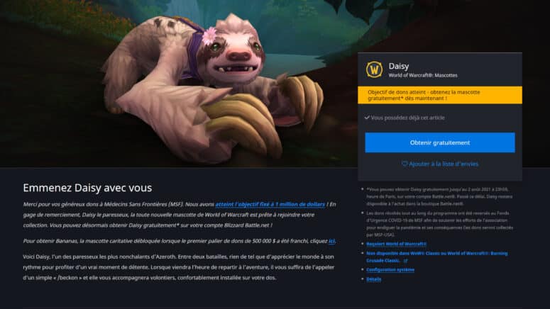 À quelques jours de la fin de la campagne du programme de bienfaisance pour l'organisation humanitaire Médecins Sans Frontières pour lutter principalement contre la pandémie du COVID-19, l'objectif final de 1 million de dollars vient d'être atteint par la communauté au bout de 36 jours de collecte. Ainsi, la deuxième mascotte caritative Daisy le paresseux est débloquée gratuitement pour tous les joueurs avec un compte Blizzard Battle.net tant qu'elle a été réclamée depuis la boutique web ou application jusqu’au 2 août inclus, à 23h59 (heure de Paris). Pour rappel, la mascotte du premier palier de 500 000 $, Bananas, reste également accessible pendant toute cette durée.