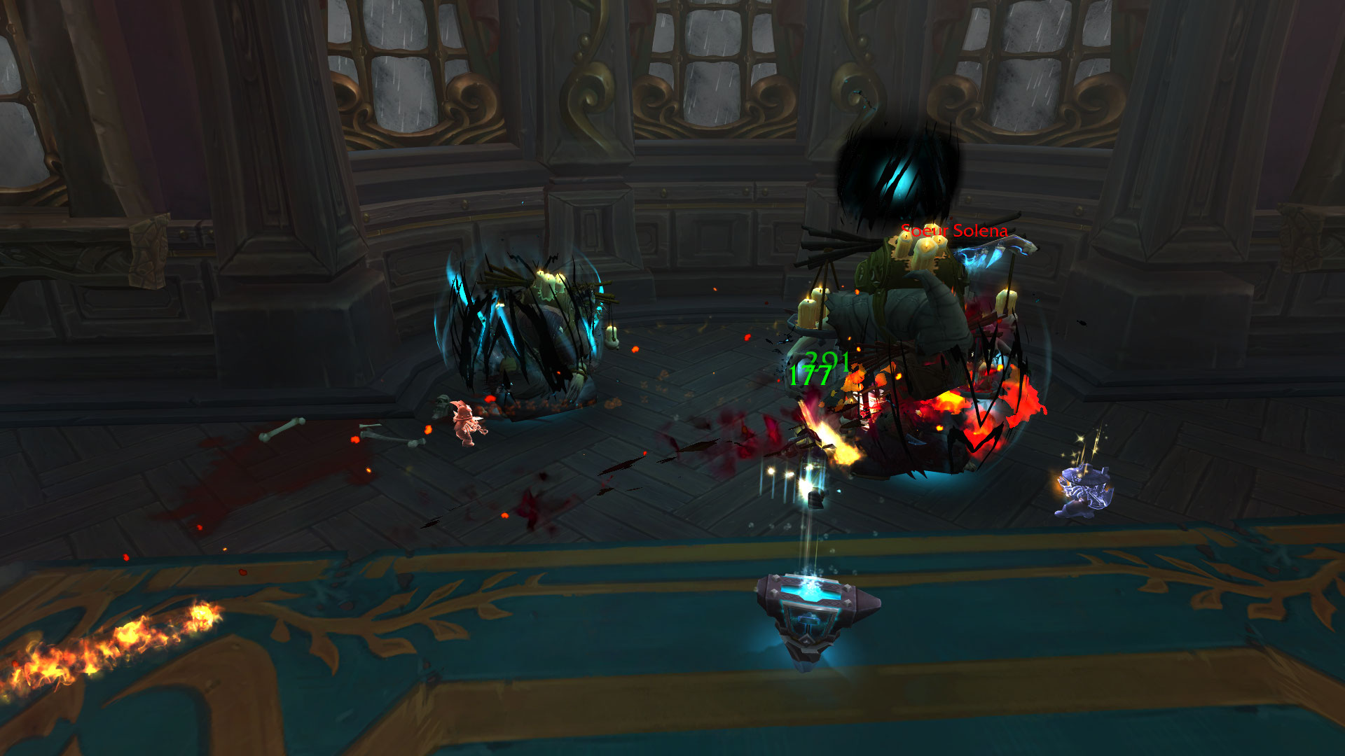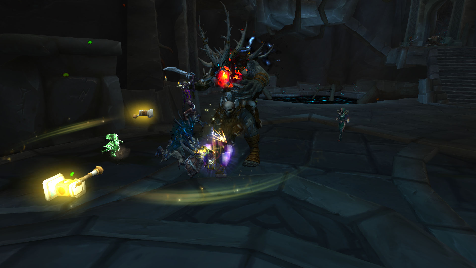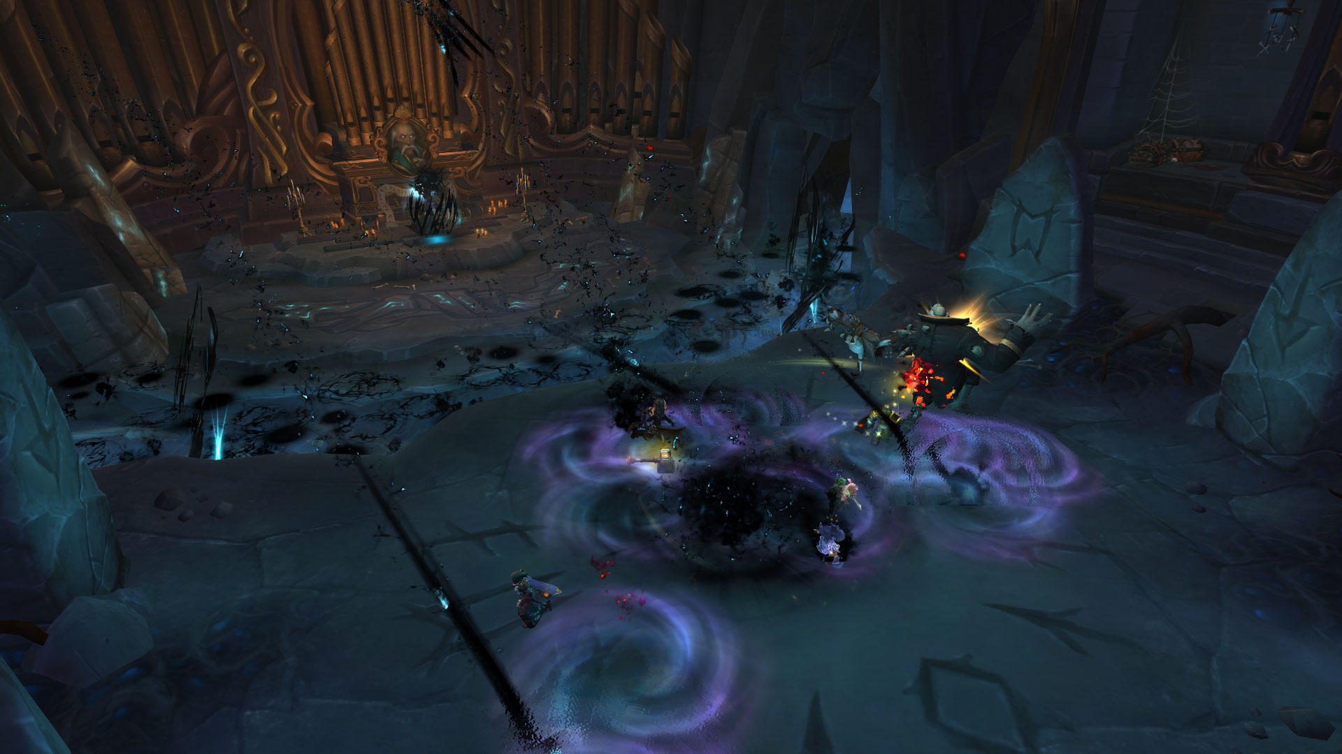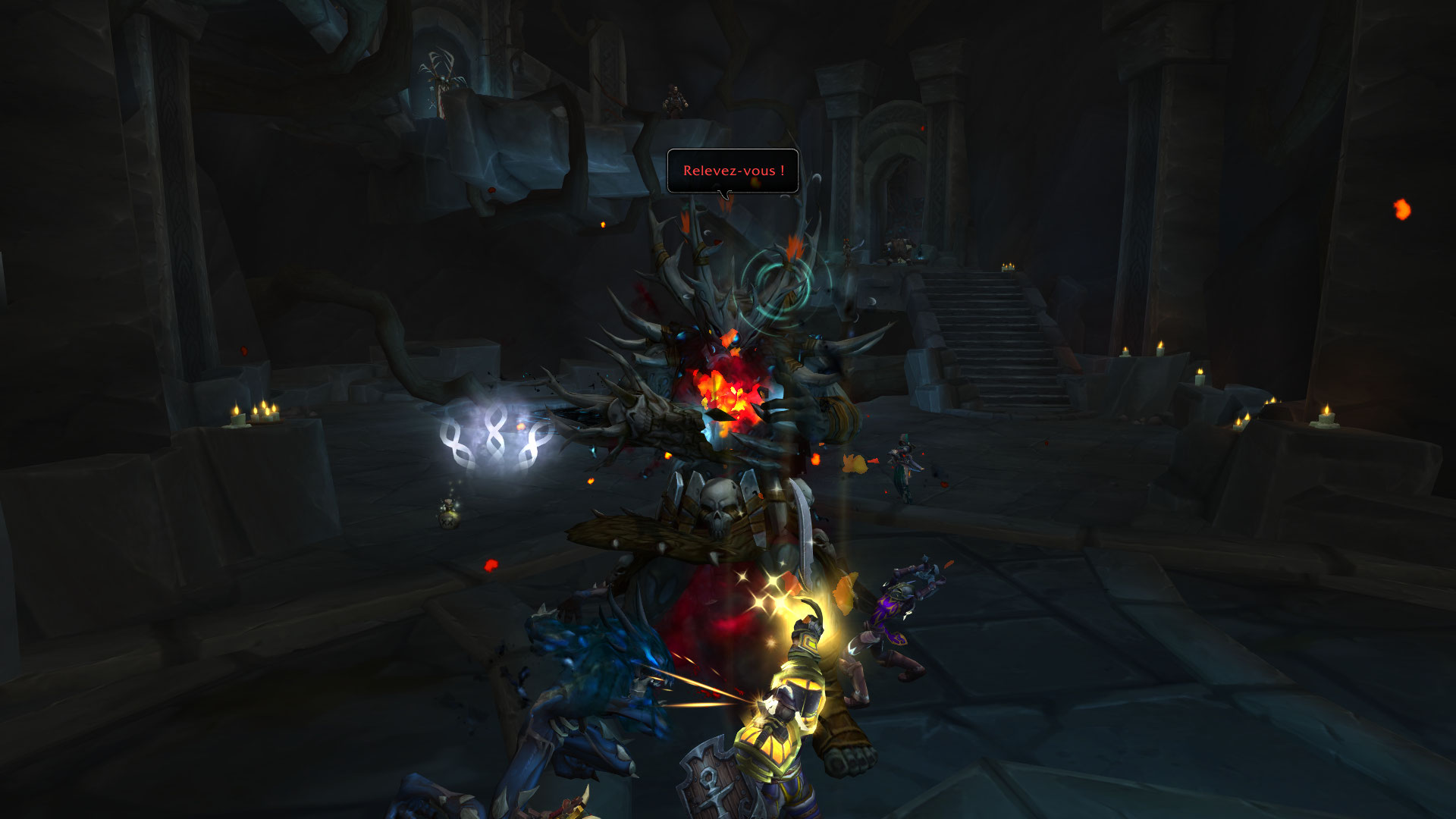 Commentaire : Le combat est très basique et il devient rapidement intense surtout à la fin du combat en raison de la récolte d'âme qui s'accumule très rapidement. Mais les nombreux feux de brousse invoqués dans l'atrium vont vous aider à limiter cette montée en dégâts graduelle. Le tank va devoir déplacer le Goliath dessus pour prendre feu. Il faudra trouver un bon équilibre pour éviter que les broussailles ardentes n'infligent trop de dégâts de zone au groupe avec les dégâts augmentés de la Récolte d'âme. La stratégie semble pointer vers un destack au début du combat et une rotation de temps de recharge défensif à la fin notamment pour le tank afin de survivre aux dégâts de l'écrasement. Vous pouvez également faire en sorte d'alterner vos temps de recharge pour les clés mythique élevées.