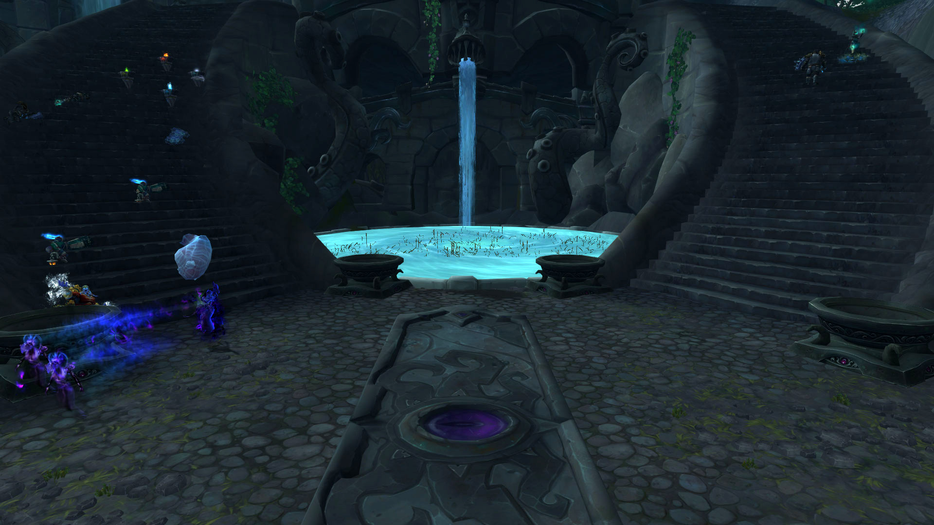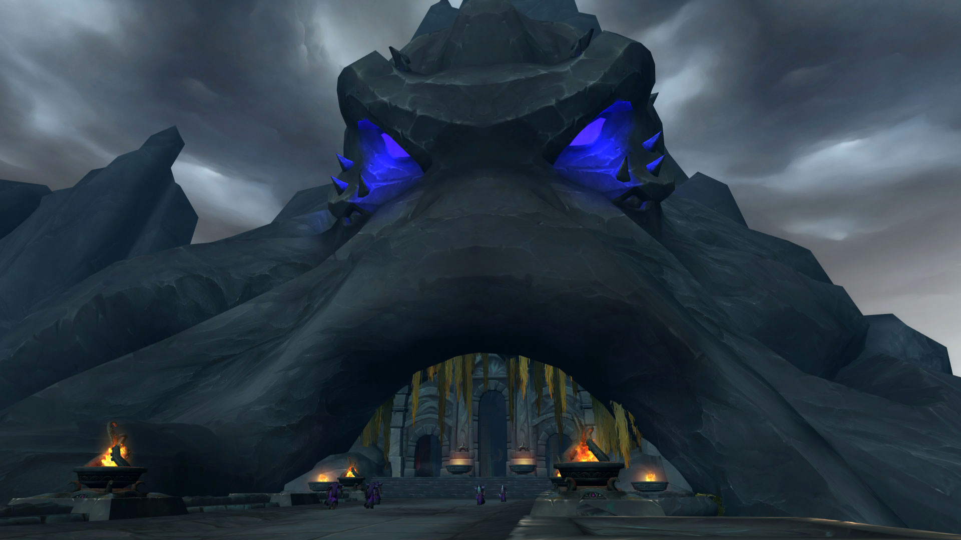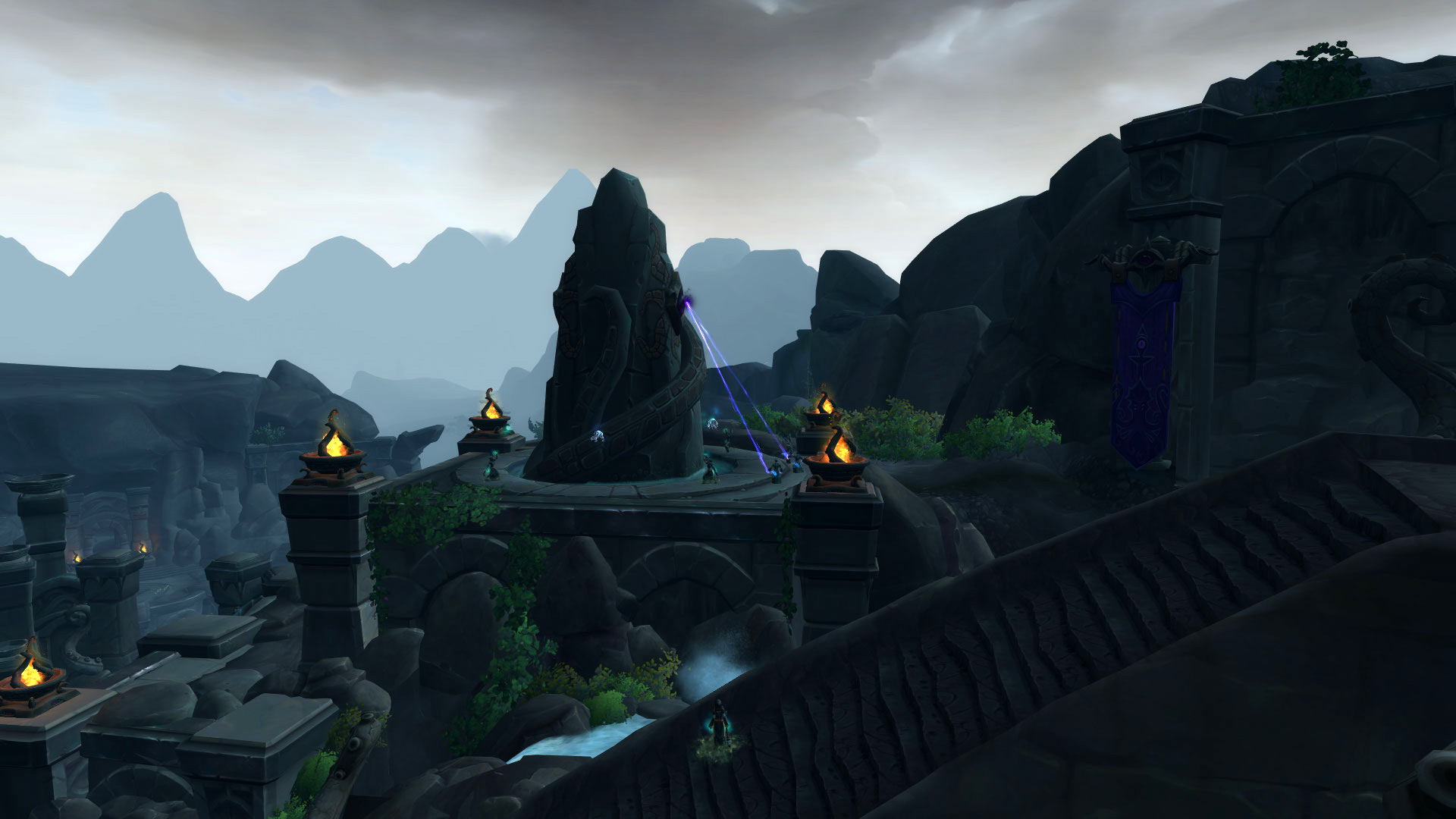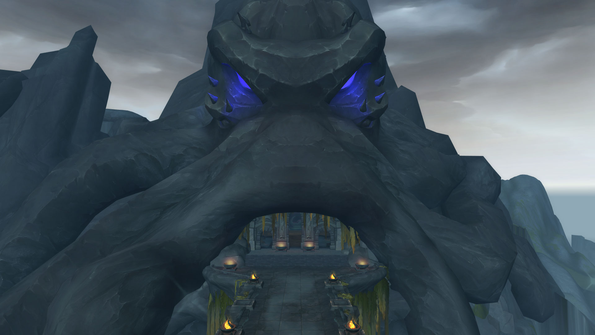 Le Sanctuaire des Tempêtes est perché dans les montagnes de la Vallée Chantorage pour que les eauracles puissent conférer leurs meilleures bénédictions aux navires de Kul Tiras. Il y a plusieurs éléments qui nous rappelle les éléments et notamment l'eau et la tempête avec des fontaines, des bassins ou même des cascades où l'eau ruisselle jusqu'aux océans du continent. On y découvre également rapidement l'influence des créatures des profondeurs notamment par cette statue de pierre ou par les emblèmes qui façonnent le donjon.
