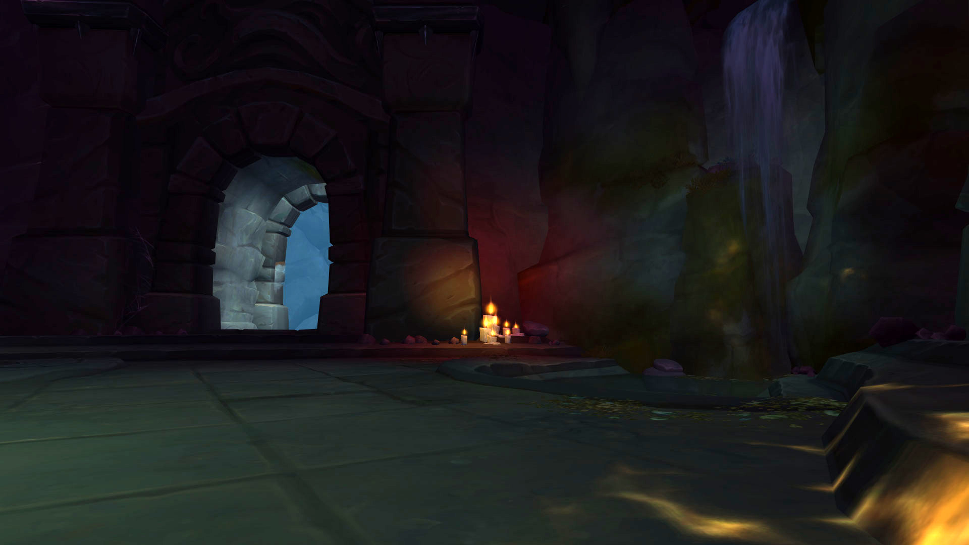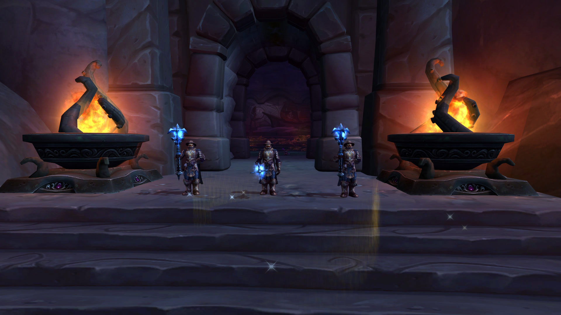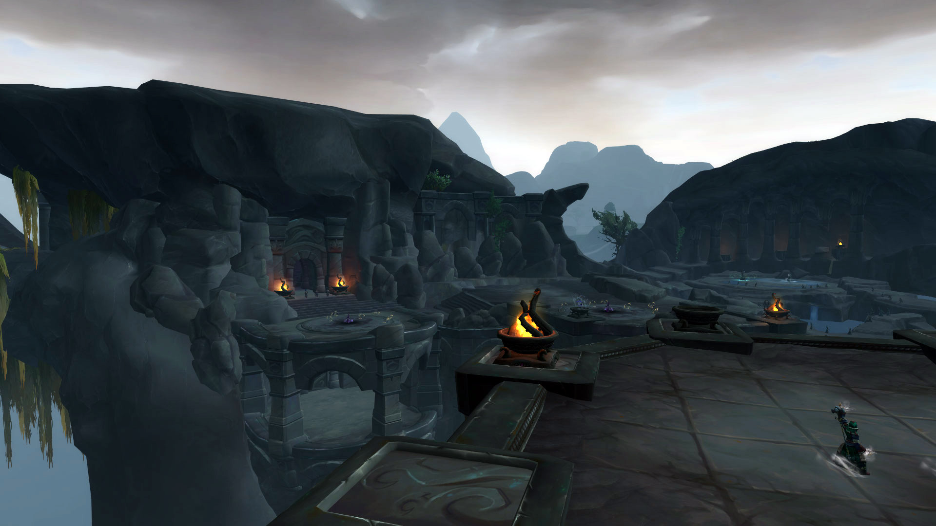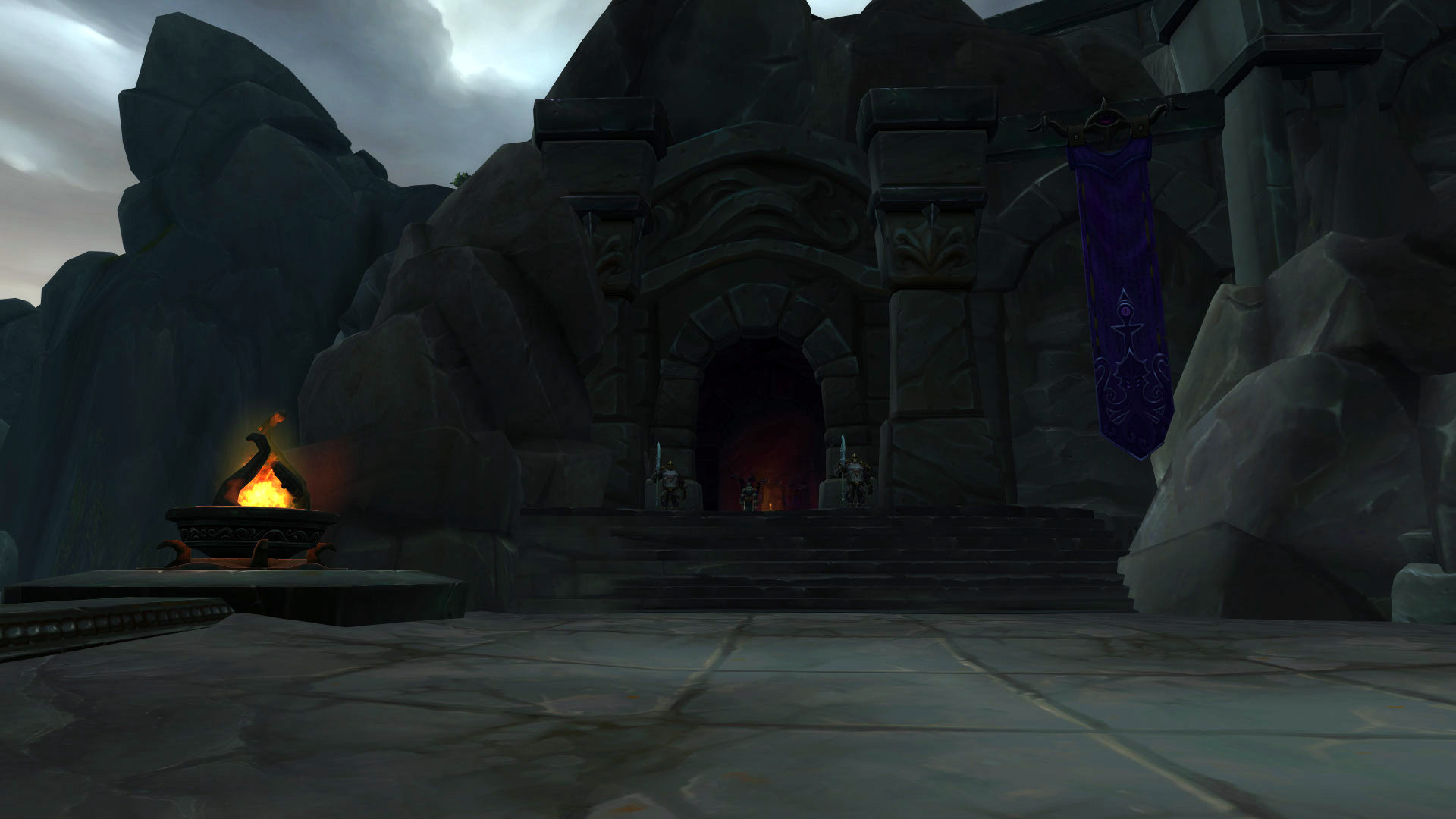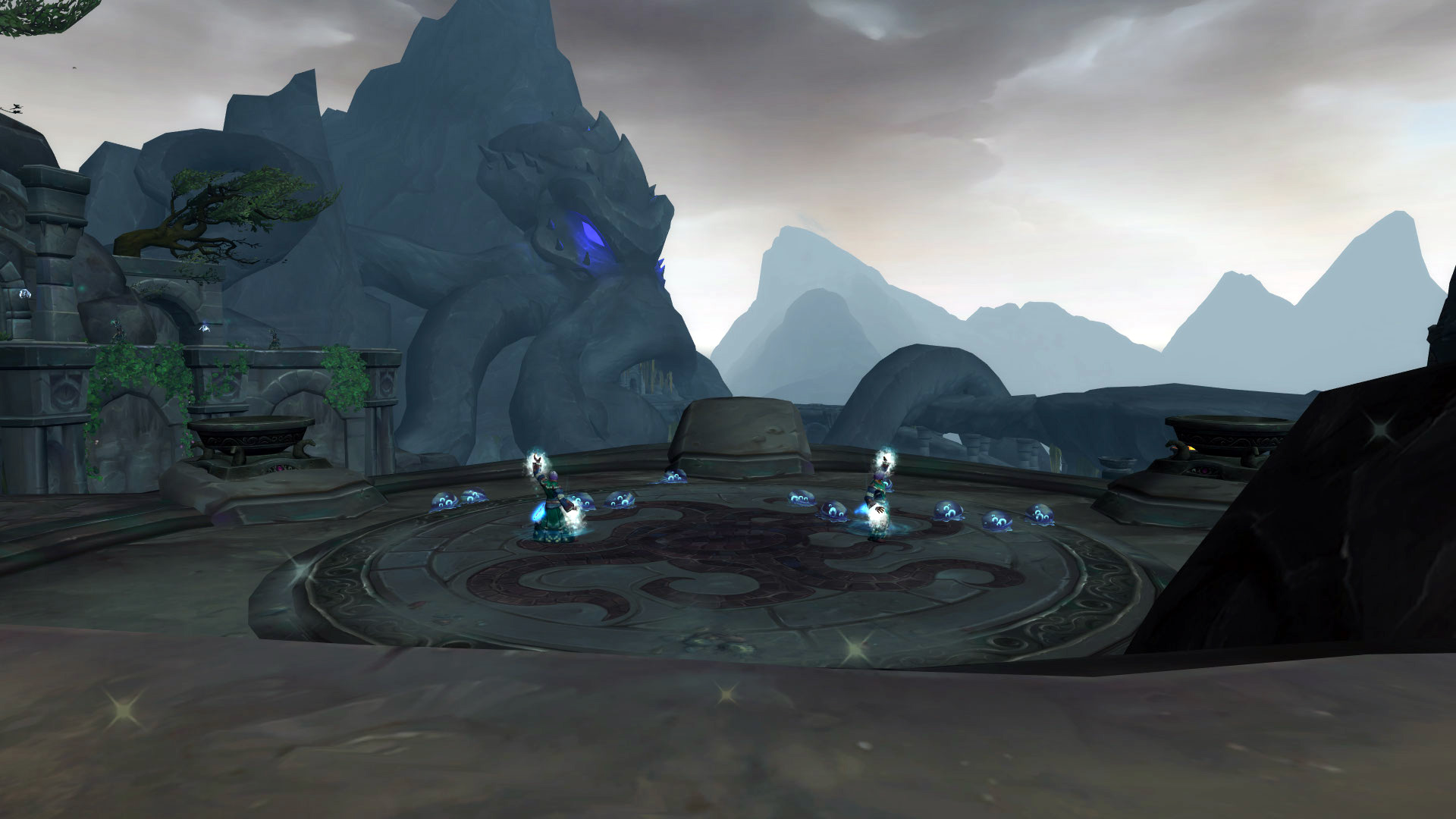 Le Sanctuaire des Tempêtes est perché dans les montagnes de la Vallée Chantorage pour que les eauracles puissent conférer leurs meilleures bénédictions aux navires de Kul Tiras. Il y a plusieurs éléments qui nous rappelle les éléments et notamment l'eau et la tempête avec des fontaines, des bassins ou même des cascades où l'eau ruisselle jusqu'aux océans du continent. On y découvre également rapidement l'influence des créatures des profondeurs notamment par cette statue de pierre ou par les emblèmes qui façonnent le donjon.
