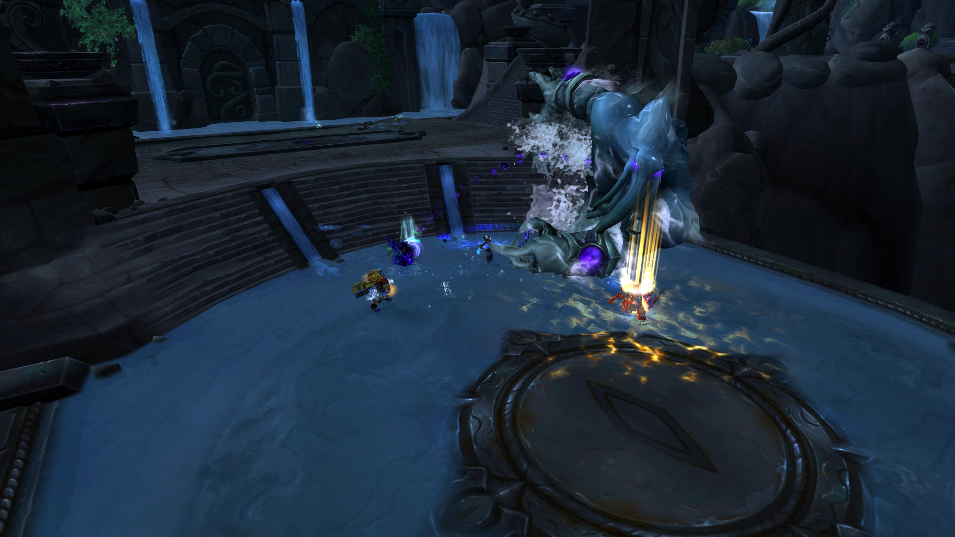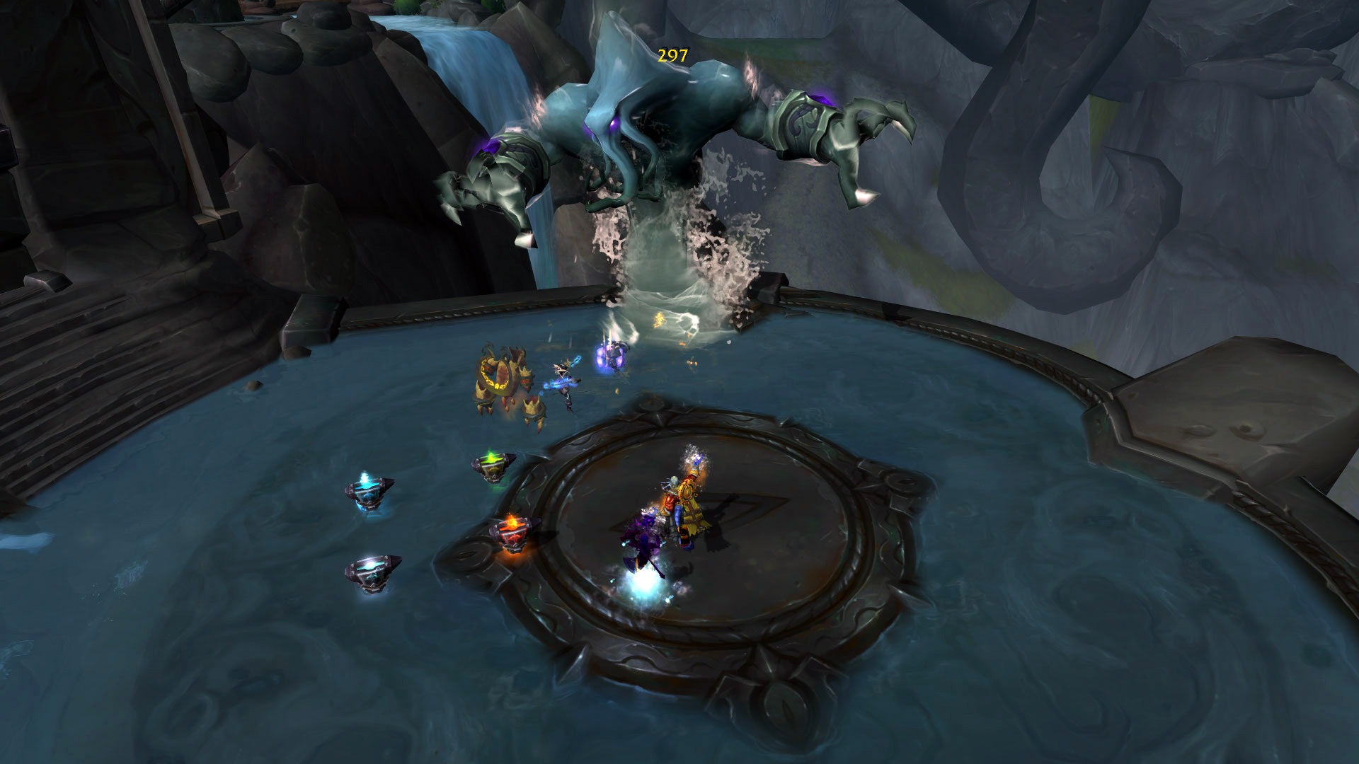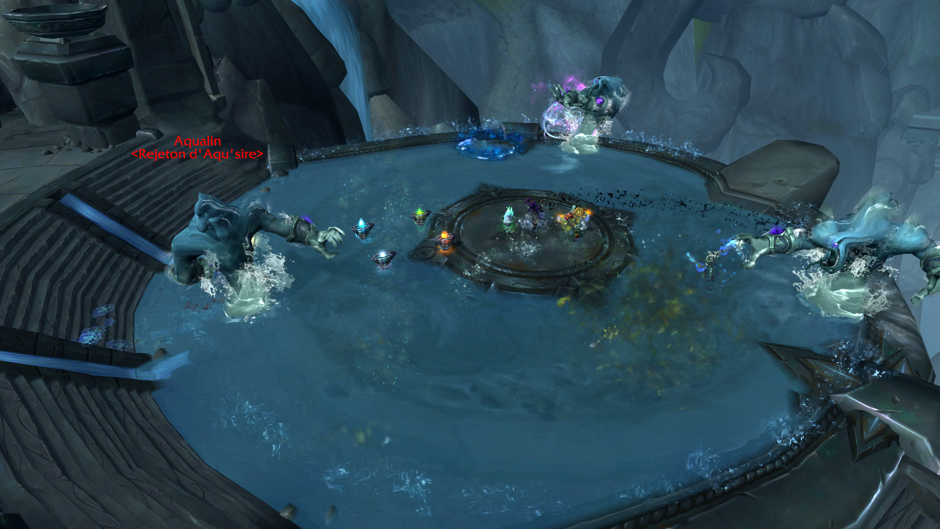 Commentaire : Le modèle de cet élémentaire d'eau et les effets visuels télégraphiés sont vraiment très bien réalisés ! Pour revenir aux mécaniques du combat, le boss dispose d'une phase d'introduction jusqu'à 50% de ses points de vie puisque sa séparation en trois va rendre le combat plus dynamique. L'une des principales difficultés sera notamment en mode mythique avec des tentacules qui retiennent un personnage-joueur en otage tant qu'elle n'est pas vaincue. Aqu'sire génère des déplacements importants par ses effets de repoussement ou d'évitement de plusieurs effets au sol.