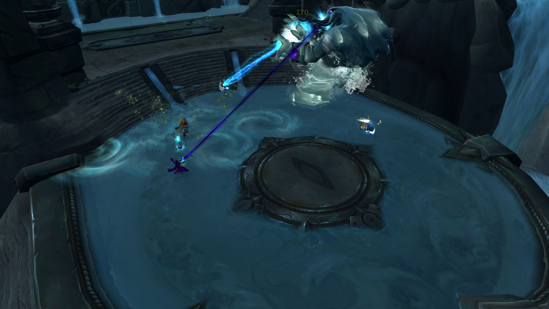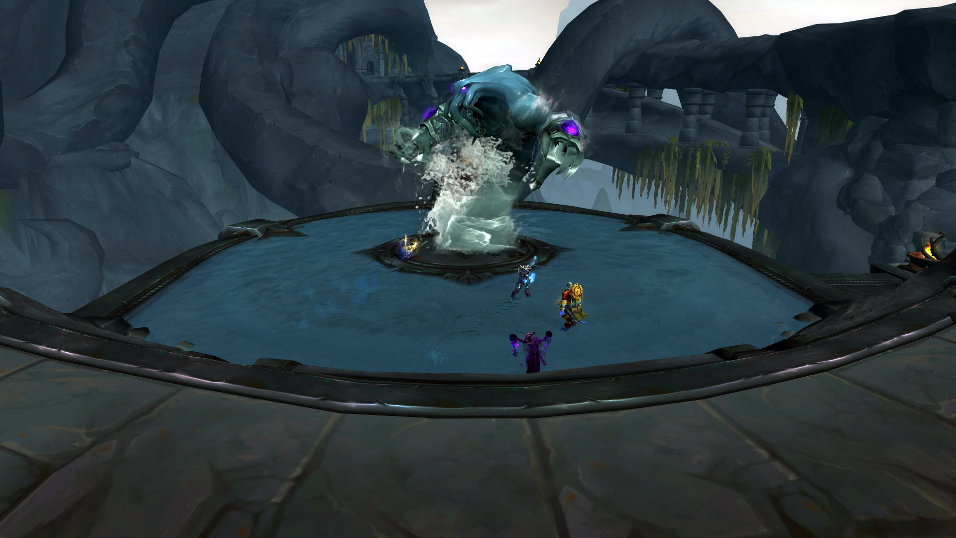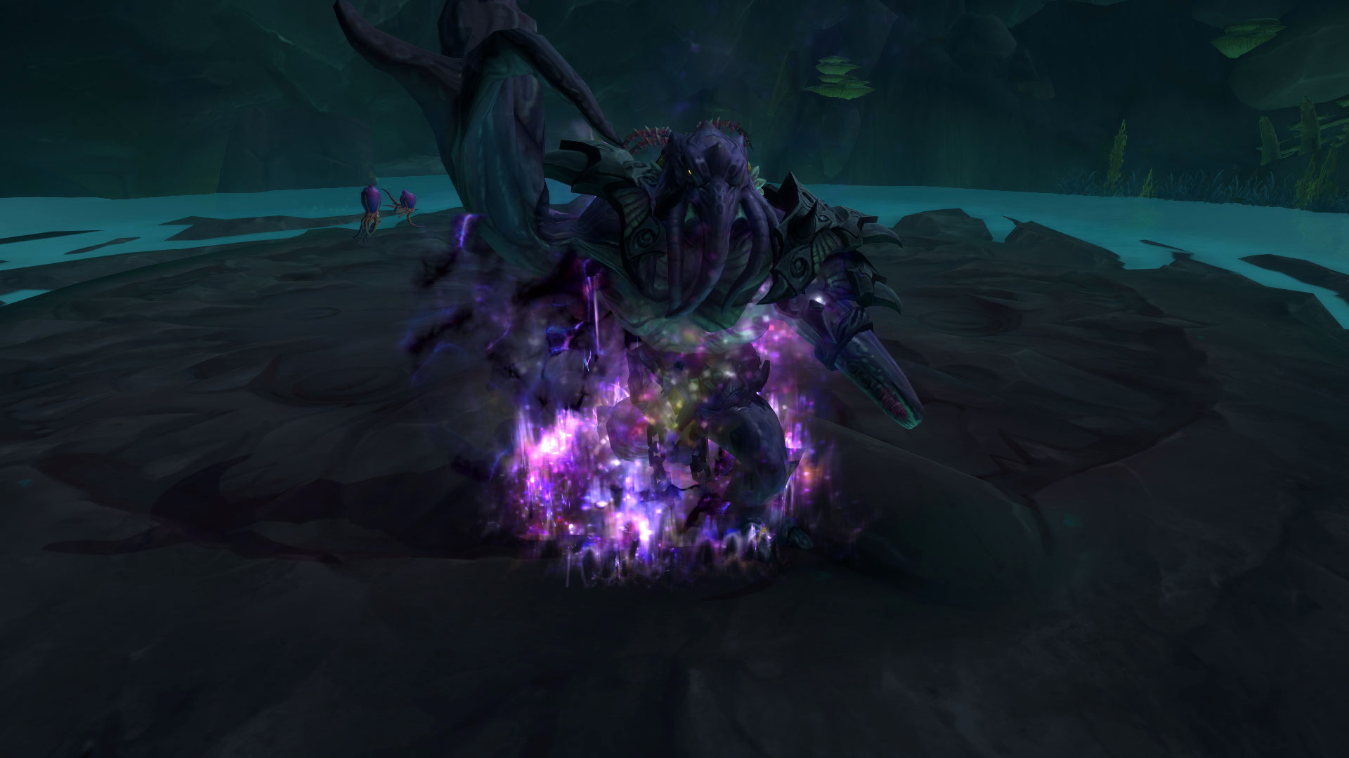 Commentaire : Le modèle de cet élémentaire d'eau et les effets visuels télégraphiés sont vraiment très bien réalisés ! Pour revenir aux mécaniques du combat, le boss dispose d'une phase d'introduction jusqu'à 50% de ses points de vie puisque sa séparation en trois va rendre le combat plus dynamique. L'une des principales difficultés sera notamment en mode mythique avec des tentacules qui retiennent un personnage-joueur en otage tant qu'elle n'est pas vaincue. Aqu'sire génère des déplacements importants par ses effets de repoussement ou d'évitement de plusieurs effets au sol.