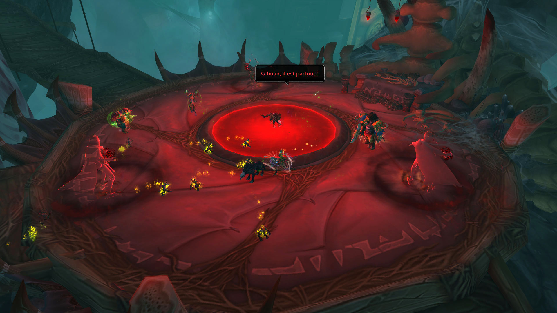 Commentaire : J'aime beaucoup la mécanique de ce combat, surtout lorsqu'il s'agit d'erreur personnelle qui se répercute directement avec la souillure de G'huun. Toutes les techniques peuvent être évitées, mise à part le trait de sang qui requiert une solide rotation d'interruption pour limiter les charges appliquées sur le tank. Pour donner du rythme au combat, les trois images de Leaxa l'Aînée par le miroir de sang est similaire à la séparation du boss Aqu'sire du Sanctuaire des tempêtes avec les techniques dupliquées. Les personnages-joueurs sous l'effet de la souillure de G'huun doivent être rapidement remontés en points de vie pour éviter qu'il ne se fasse submerger par les dégâts subis.