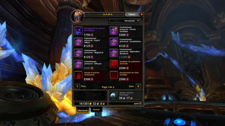 D.A.M.E. à la chambre du Cœur en Silithus propose des essences du Cœur d'Azeroth et corruption sur l'équipement :