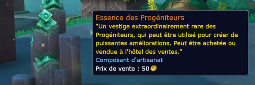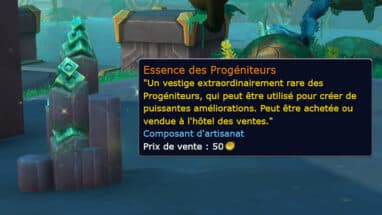 L'essence des Progéniteurs est un objet non-lié au personnage qui se place dans l'inventaire lorsque vous amassez l'un de ces composants extraordinairement rare de Zereth Mortis à travers plusieurs modes d'obtention. Cette essence est indispensable pour augmenter la puissance des objets légendaires de Shadowlands avec l'équivalent de 3 rangs supplémentaires par le nouveau composant d'artisanat optionnel du Vestige de l'Éternel.
