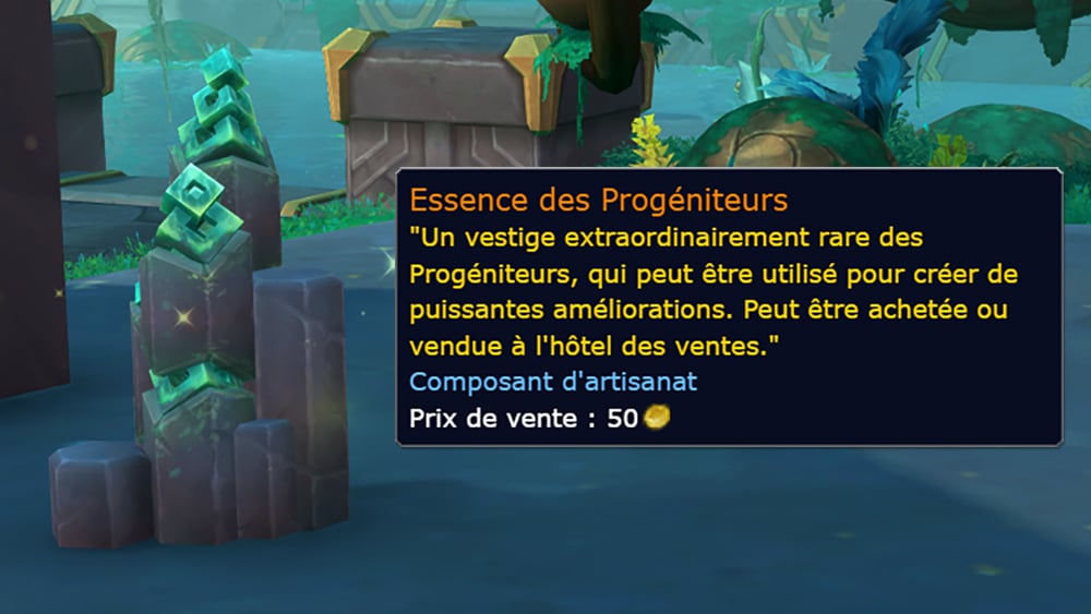 Zereth Mortis, nouvelle zone de la mise à jour 9.2 de Shadowlands, contient plusieurs ressources pour tous les métiers d'artisanat de l'Ombreterre. À travers ces nouveaux composants, l'essence des Progéniteurs est un objet légendaire, similaire aux cristaux de korthite de la mise à jour précédente. Contrairement aux cristaux de korthite, cet objet est une ressource extraordinairement rare dont le prix sera très élevé depuis l'hôtel des ventes. Toutefois, un avantage de la console cryptique est en mesure de renforcer le pourcentage de chances par une amélioration temporaire conférée avec les Jiros sonores.