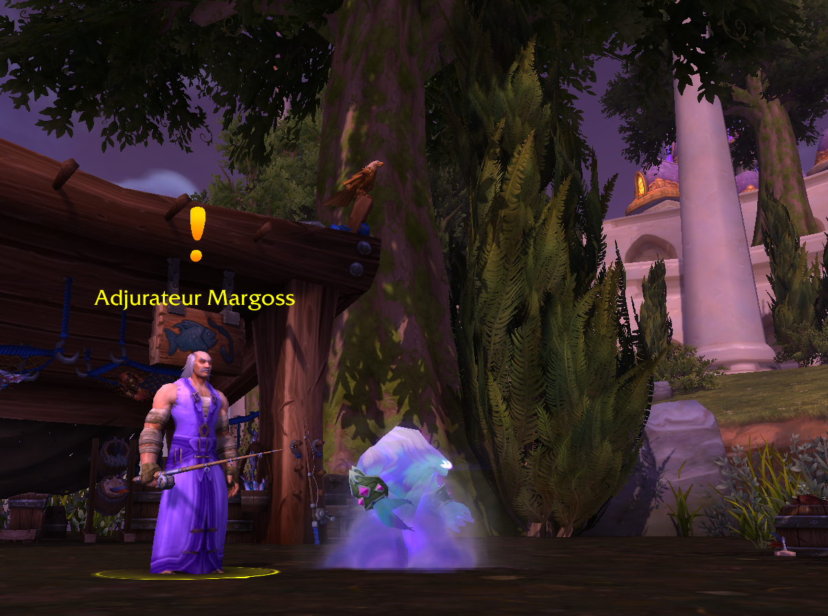 L'adjurateur Margoss se trouve sur une des petites îles flottantes au alentour de Dalaran. Sauf que pour vous y rendre, vous devez aller dans les égouts de Dalaran, dans la zone du Marché noir et pêcher un