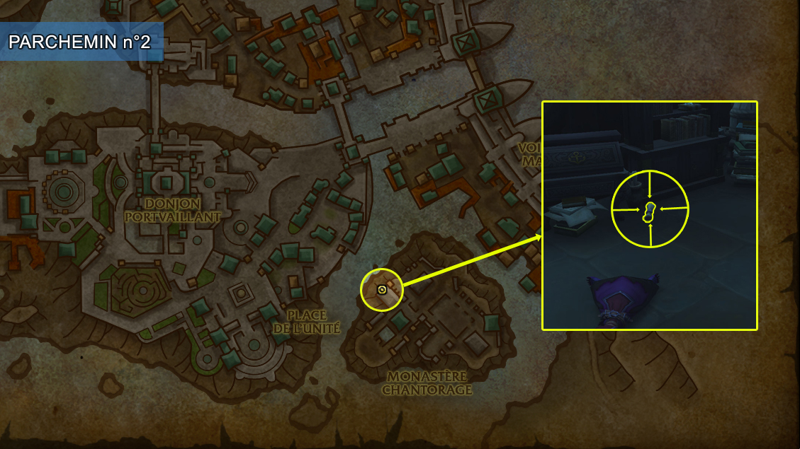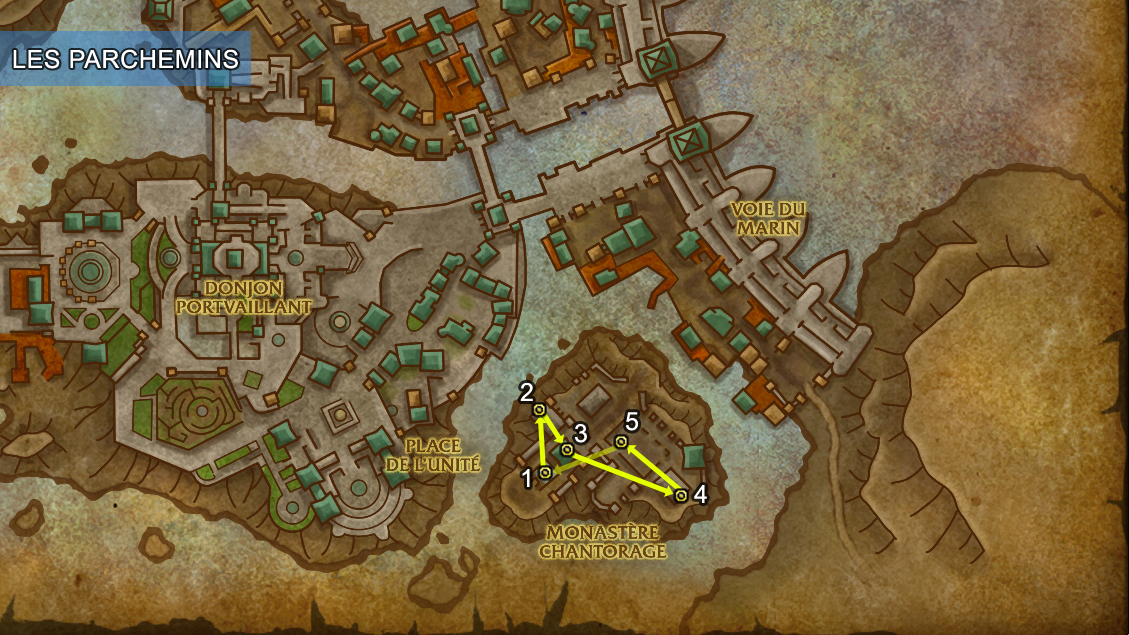 Pour démarrer cette petite aventure dans le Monastère Chantorage à découvrir l'emplacement de ce jouet particulier, plusieurs parchemins devront être consultés dans un ordre précis afin de compléter un « code » à l'autel menaçant. Les lignes de dialogues avec cet autel dissimulé dans une grotte par un bassin d'eau au centre du monastère sont verrouillés tant que vous n'avez pas interagi avec les 5 parchemins proposés du guide. Ces codes inscrits sur chaque parchemin complètent le dialogue nécessaire à l'incantation pour se rendre à l'emplacement du jouet.
