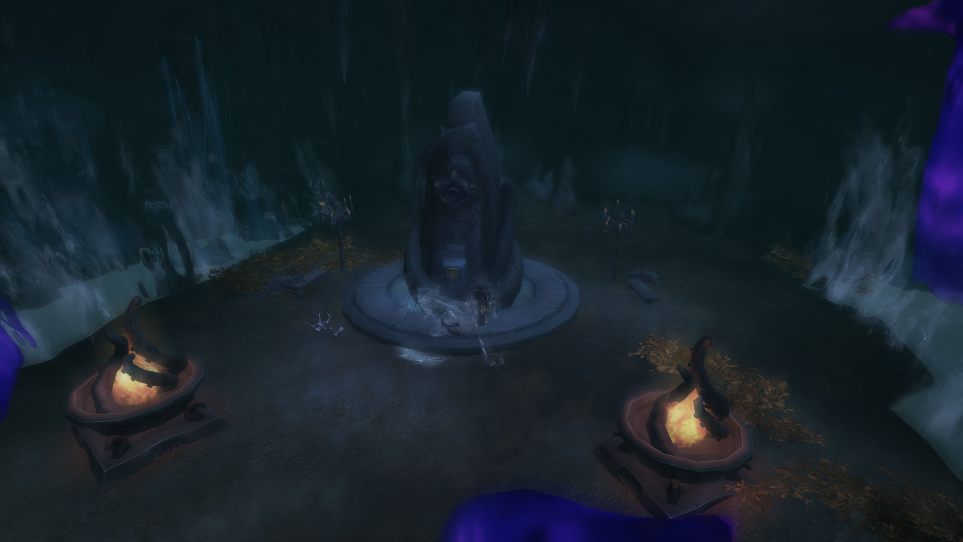 61.3 84.0 dont laquelle quelques eaugures canalisent leurs énergies aqueuses à l'intérieur de celui-ci. Ce bassin d'eau permet de tomber sur cette grotte avec un autel menaçant au bout de celle-ci qui servira pour l'étape finale. A proximité de celui-ci, se trouve un squelette à gauche avec un parchemin humide tenu dans sa main.