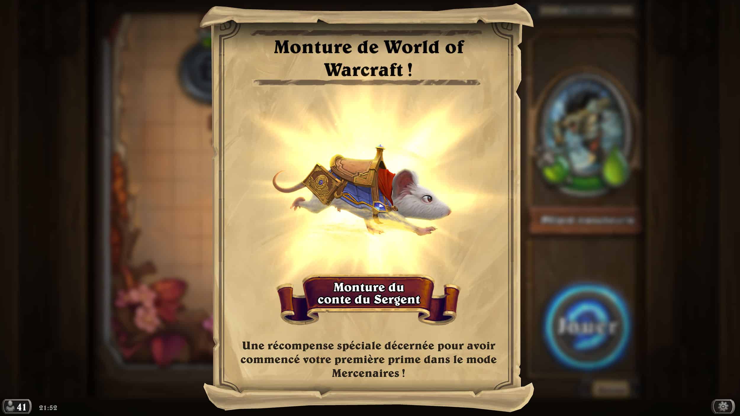 Depuis le mardi 12 octobre, le nouveau mode « Mercenaires » est disponible sur le jeu de cartes Hearthstone dans toutes les régions du monde. Ce nouveau mode de jeu gratuit, combinant des éléments de jeu de rôle et de roguelike, permet d'obtenir la nouvelle monture Histoire de sergent sur World of Warcraft lorsque le didacticiel est terminé. La fosse de combat des Mercenaires sur Hearthstone accueille tous les nouveaux aventuriers pour chasser des primes avec un groupe composé de six mercenaires au maximum contre plusieurs ennemis jusqu'au boss final. Ce prologue ne requiert aucune expérience, aucune pièce d'or ou argent réel pour obtenir gratuitement cette monture au bout de plusieurs minutes d'introduction.