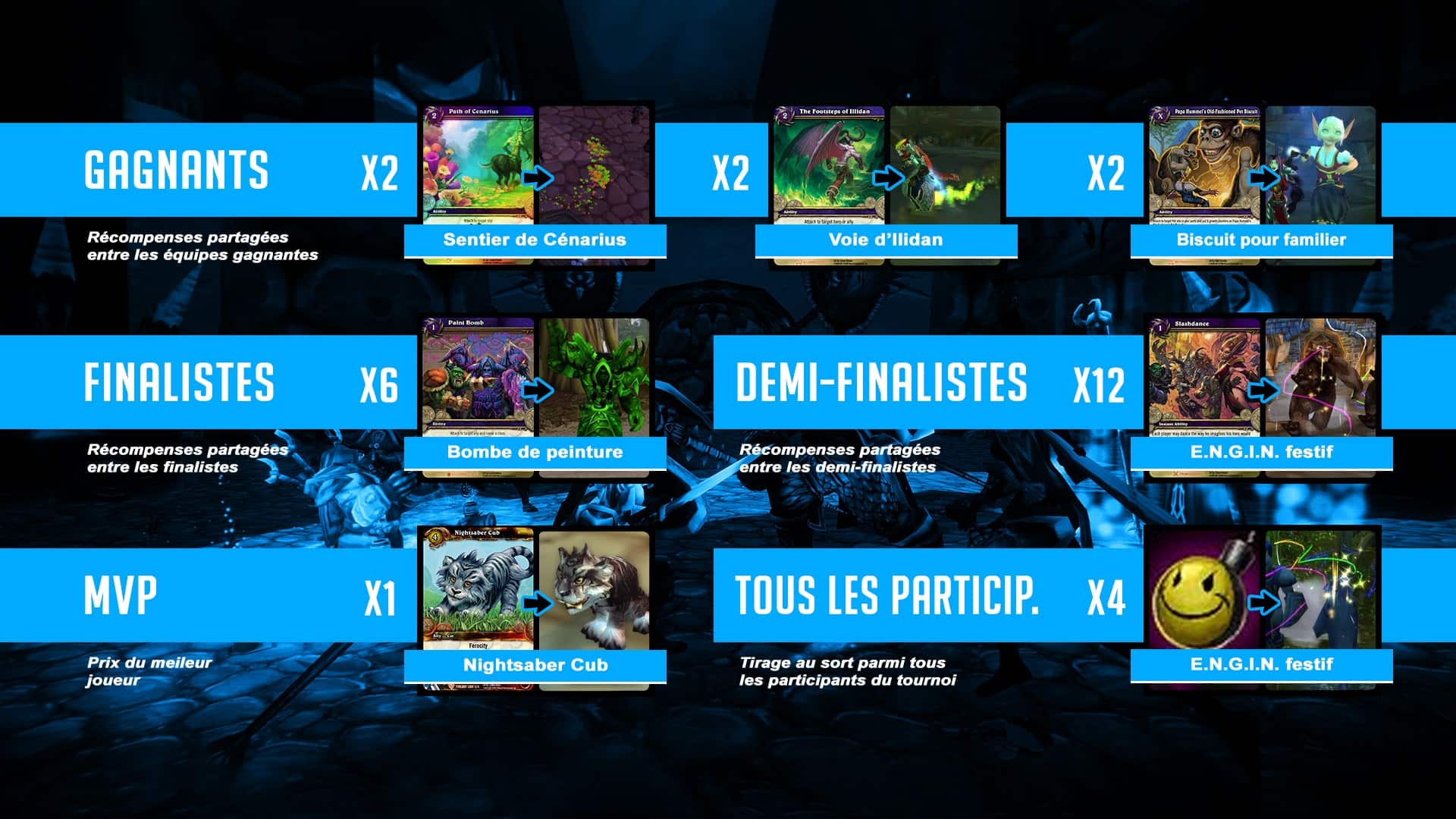 Les participants au tournoi ont une chance d'obtenir plusieurs récompenses avec 29 lots mis en jeu par la communauté et jusqu'à 120€ de « cashprize » pour les équipes gagnantes. Notez également que des récompenses seront également offertes aux spectateurs pendant la diffusion de l'événement. La plupart de ces lots proviennent des cartes de butin très rares en jeu, donc n'hésitez pas à tenter votre chance pour affronter les équipes 3v3 adverses.