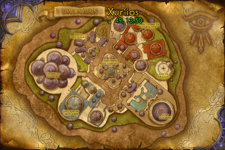 Pièces curieuses va servir au Gardien du coffre du Vide Xur'ios à Dalaran pour acheter des récompenses pour vos métiers mais également des objets voir même une monture tortue. Celui-ci se trouve dans la cité de Dalaran aux îles brisées à la banque nord à proximité du Monument à l'hommage pour le grand mage Antonidas aux coordonnées : 49, 13.50 entre deux balises éthériennes. Vous pouvez retrouver son emplacement dans la carte ci-dessous :