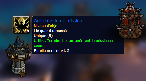 Ordre de fin de mission qui permet de terminer instantanément une mission en cours sélectionnée hors des missions légendaires. Ces ordres de missions se récupèrent via les commandes de ce bâtiment de fief en l'alimentant des