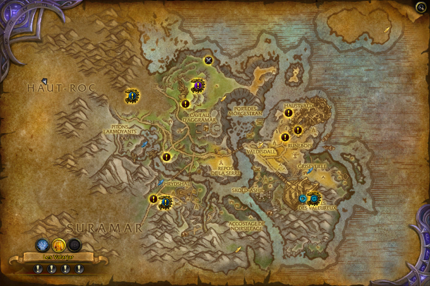 Plusieurs types d'icônes vous informent rapidement de l'activité comme un point d'exclamation classique pour une quête, une quête de groupe rare signalée par un dragon doré qui l'encadre, une quête de donjon rare en héroïque signalée par une tête de mort et ornure dorée, une icône de métier comme la pêche ci-dessous, une icône de mascotte, des épées pour le PvP et une icône épique en violet pour indiquer une activité de World boss :