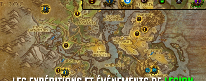 La progression au cours d'une extension est une étape primordiale pour faire évoluer son personnage avec des niveaux, mais Legion apporte une nouvelle fonctionnalité enrichissante au niveau maximum. Pour rappel, le continent des Îles brisées est adapté à votre niveau et lorsque vous disposez du niveau 110, vous débloquez ainsi les expéditions. Ces expéditions sont des événements en plein air sur une base de 500 à 600 activités aléatoires dans toutes les zones des Îles brisées qui concernent plusieurs activités comme des objectifs pvp, mascottes, de professions, terrasser des menaces (world boss, rares, mobs), résoudre des énigmes et plein d'autres...