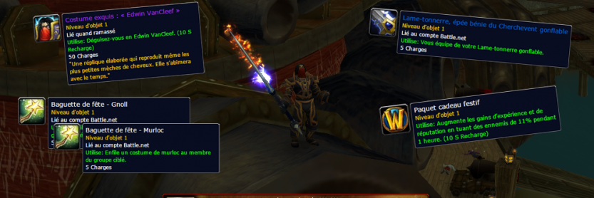 Outre cette petite mésaventure, je trouve les cadeaux super sympas! On voit enfin l’apparition du costume de Edwin VanCleef!, je trouve juste dommage que le costume murloc ne possède que 5 charges, moi qui adore les murlocs :(