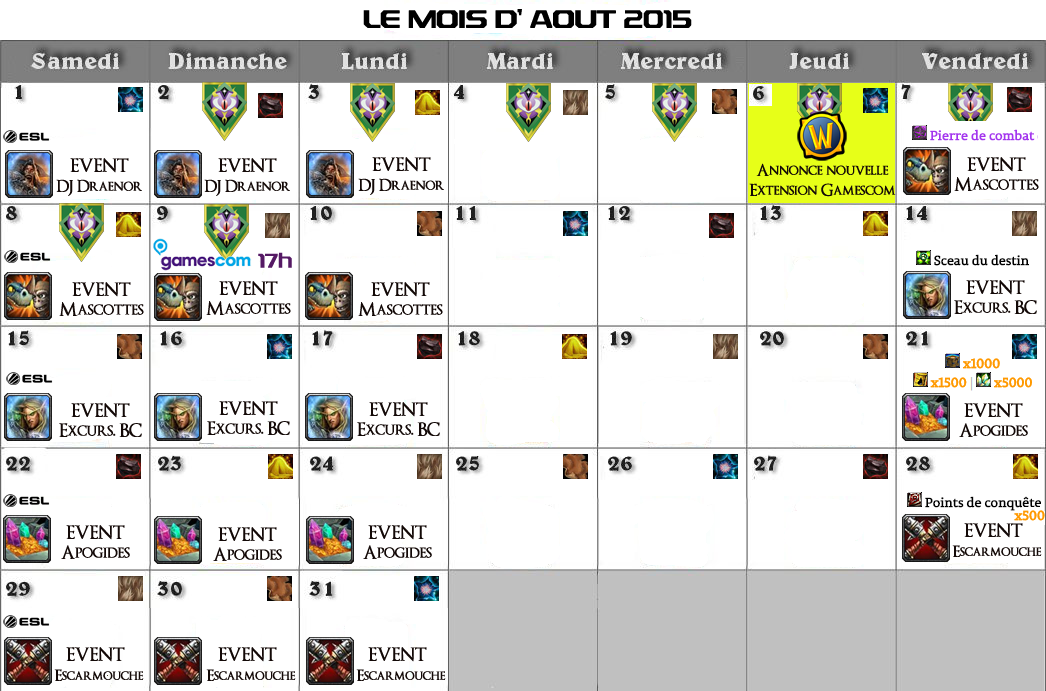 Une nouvelle aube se prépare pour World of Warcraft avec des rendez-vous importants pour le mois d'Août, dont plusieurs événements ne sont à manquer sous aucun prétexte ce mois-ci. Entre l'annonce de la nouvelle extension lors de la Gamescom ainsi qu'une interview spéciale des développeurs pour ce dimanche 9 août, et les nouvelles étapes de qualification d'E-sport pour la Blizzcon : notre calendrier est disponible pour vous renseigner des rotations de métiers, événements bonus et de ses récompenses et enfin des rendez-vous notifiés.