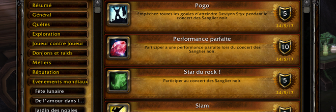 Un nouveau groupe de rock déjanté rejoint la foire de Sombrelune, après les Elite Tauren Chieftain aussi connu sous le nom de E.T.C., avec les Sanglier-noir par un espace réservé pour faire référence au hellfest. Ce nouvel événement permet de regrouper les réprouvés à célébrer l'esprit du rock toutes les heures à la demi pétante avec ce groupe de rock qu'il faut défendre d'un ennemi qui veut prouver qu'il est le roi du heavy métal. Des récompenses sont toutefois prévues avec des heaumes transmogrification, une masse à deux mains en forme de guitare, des masques cosmétiques et un tas de nouveaux hauts-faits.