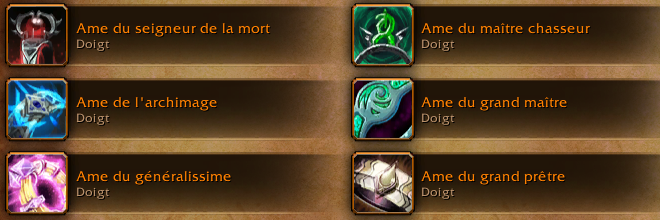 Les bagues légendaires de la mise à jour 7.2.5 permettent d'activer un talent par défaut en fonction de la spécialisation active. Ces dernières disposent d'un niveau d'objet de 940 (améliorable jusqu'à 970 avec l'ouverture de la tombe de Sargeras par une suite de quêtes) avec la seule caractéristique de l'endurance, trois statistiques secondaires mineures et une chasse prismatique. Bien évidemment, ces bagues sont communes à toutes les spécialisations de butin et ne contournent pas la limite des 2 légendaires équipés.