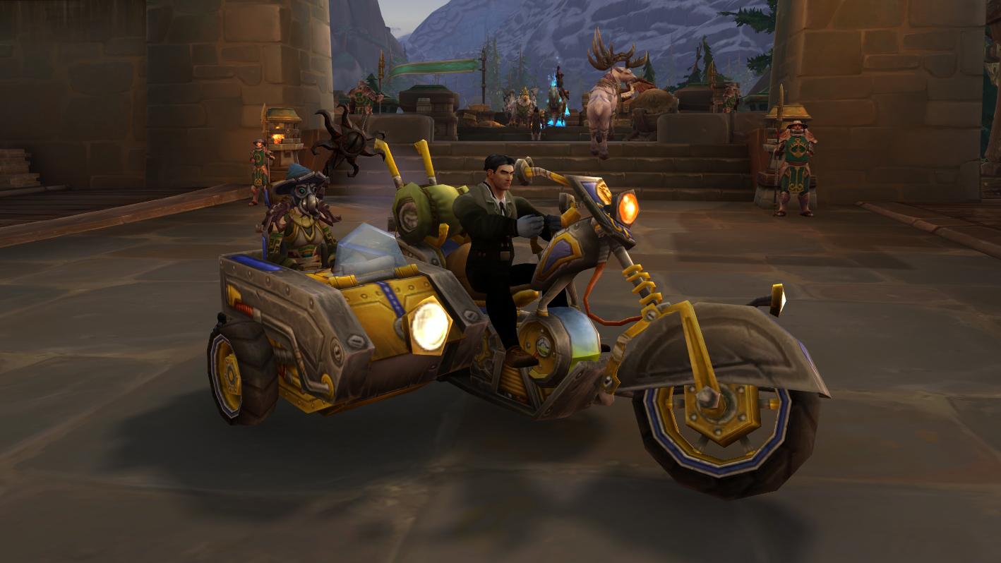 Bécane de mekgénieur avec chauffeur. Cette monture spéciale peut être utilisée par tous les personnages, y compris ceux de niveau 1 avec une vitesse de déplacement de 60%.
