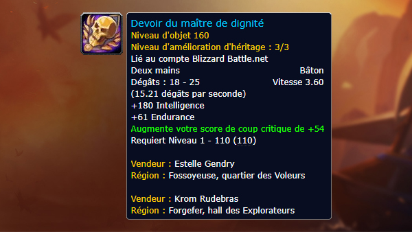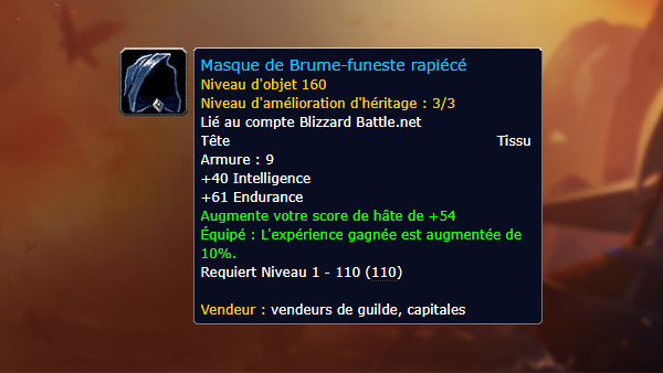 Après, il faut savoir que les objets héritages fonctionnent uniquement jusqu’au niveau 110 au maximum à l’heure actuelle, ça sera certainement étendu jusqu’au niveau 120 dans les prochains mois ! Bon courage pour reprendre WoW, hésite pas en cas de besoin !