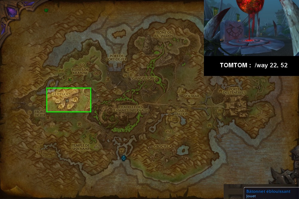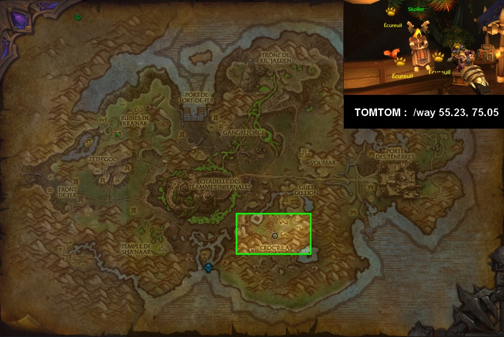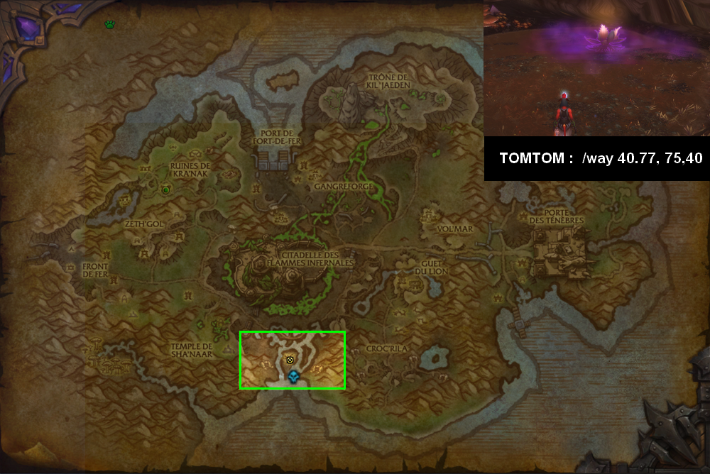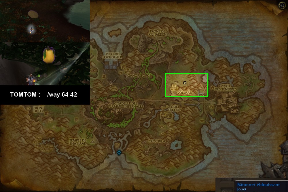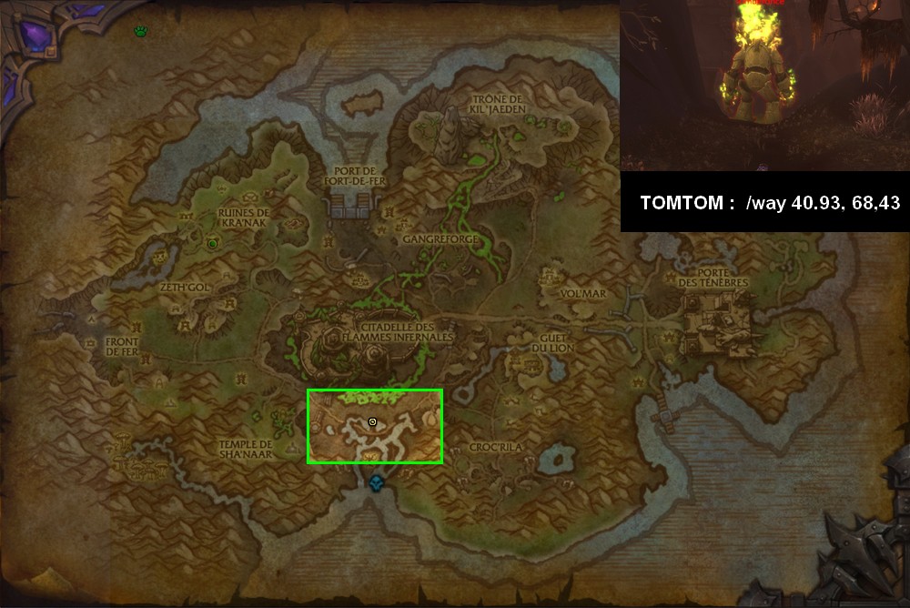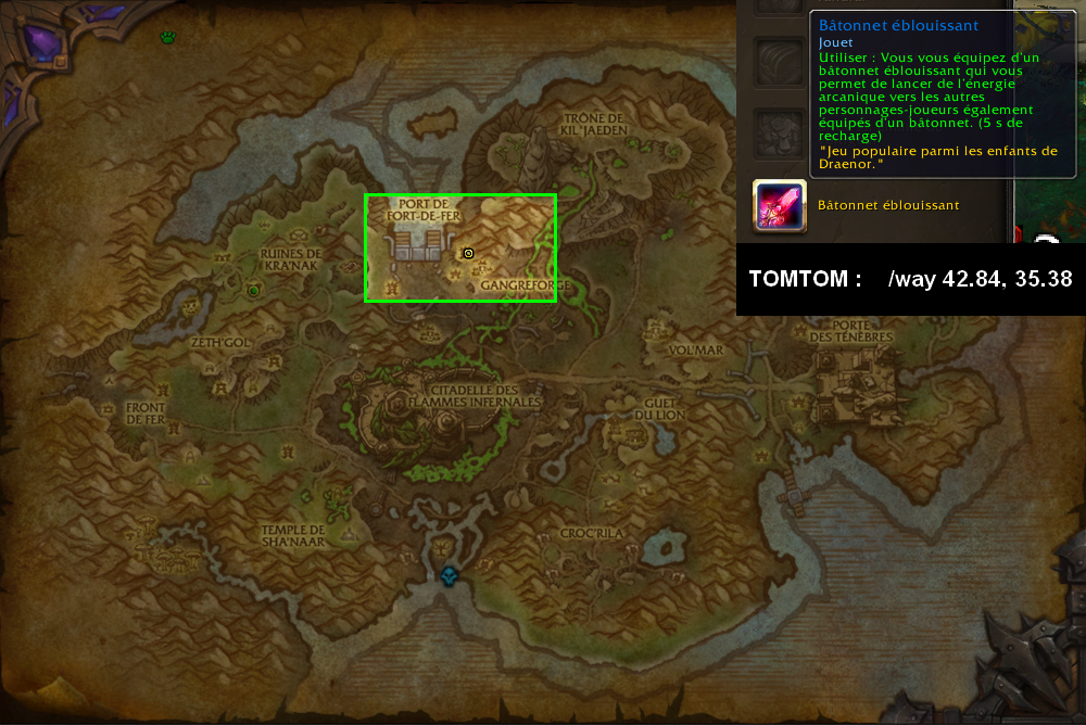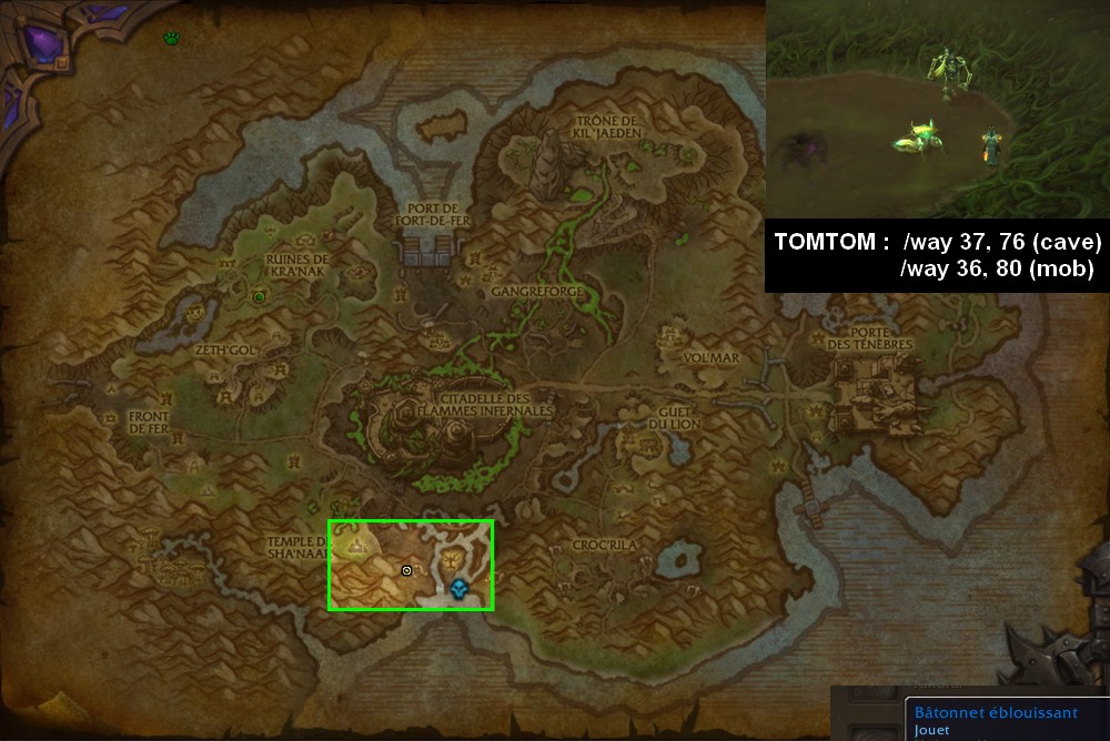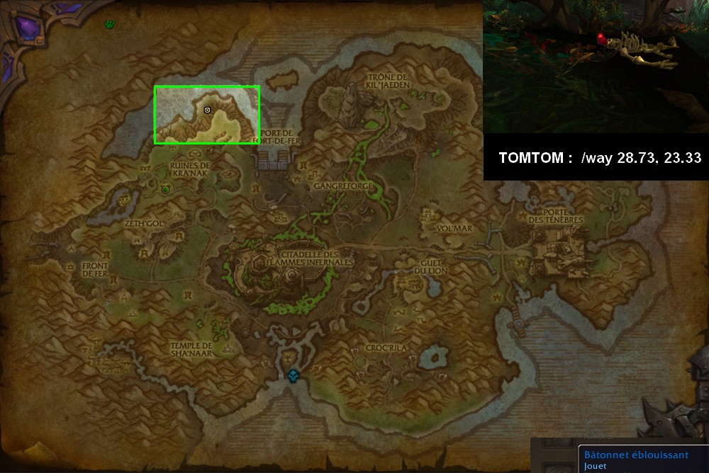 La nouvelle zone principale de la jungle de Tanaan à la mise à jour 6.2 regorgent de nouveaux jouets en découvrant dans un premier temps, les trésors dissimulés aux quatre coins de cette zone et dans un second temps, les créatures rares qui ont une table de butin bien fournie où même des vendeurs dans cette même zone. Dans le guide ci-dessous, vous retrouverez toutes les informations nécessaires pour récupérer ces jouets avec leurs coordonnées, l'addon TomTom est hautement conseillé pour créer des points de passage avec la commande /way coordonnées (ex : /way 42.84, 35.38), mais nous vous proposerons la carte ainsi qu'une vidéo dans la mesure du possible en cliquant sur l'icone dédiée :
