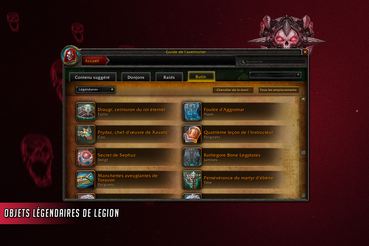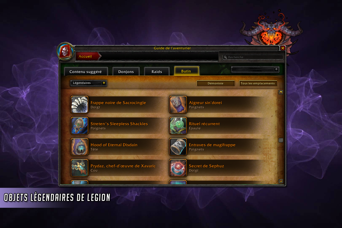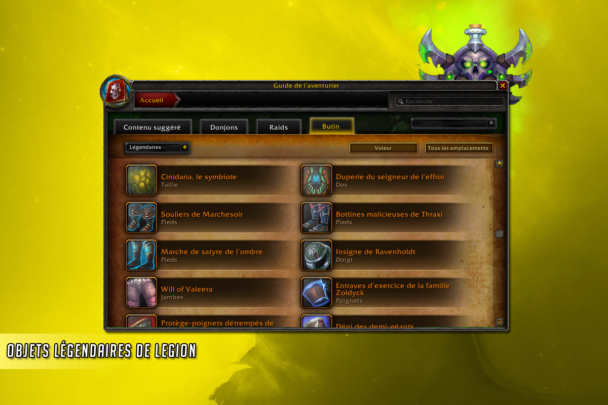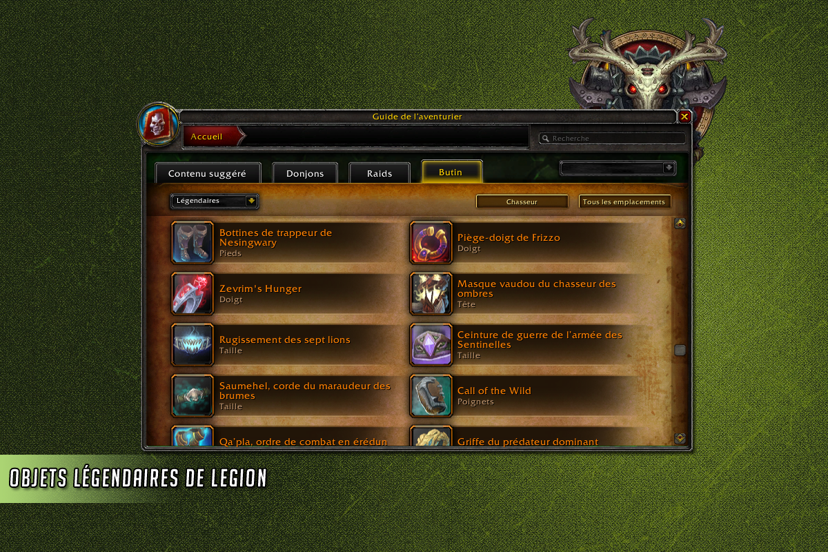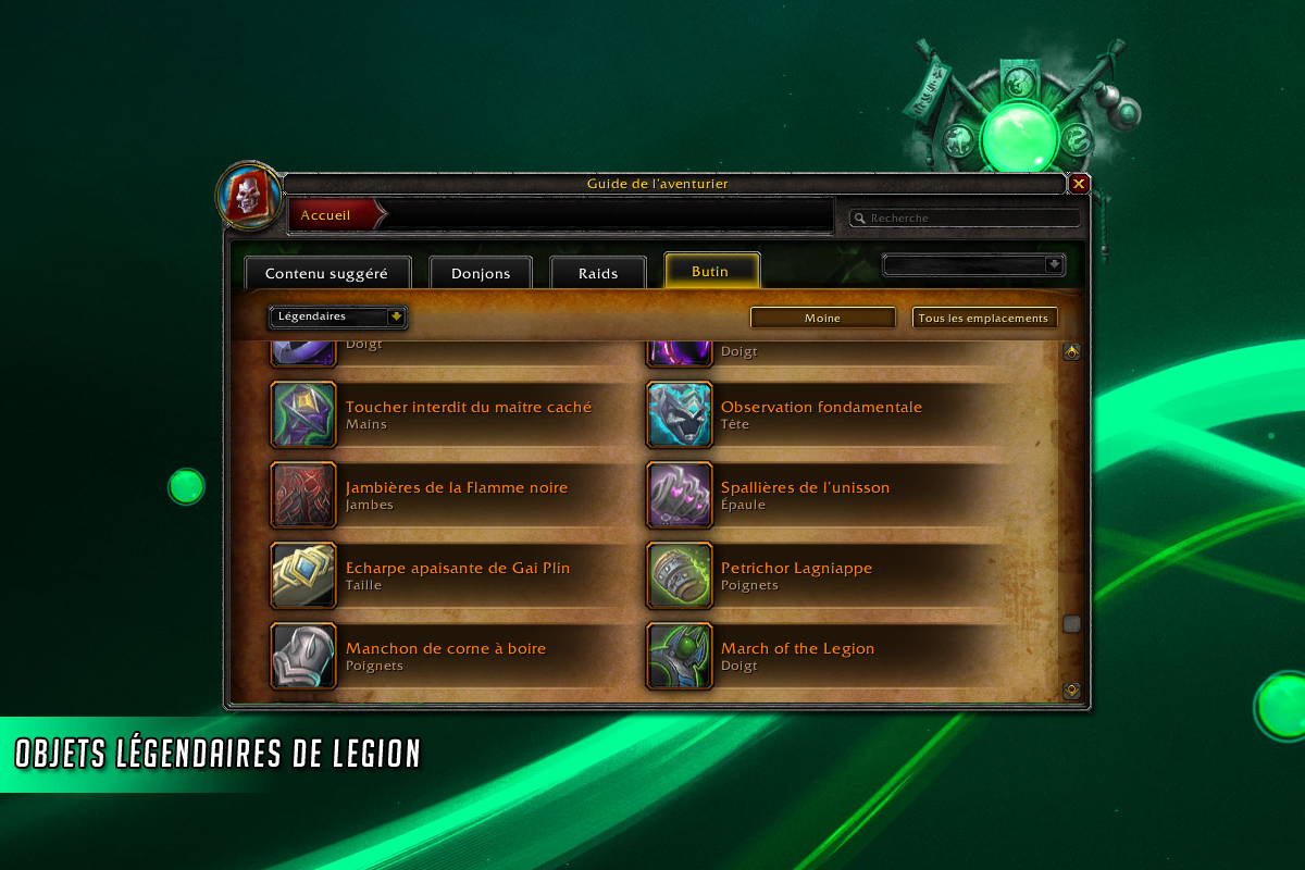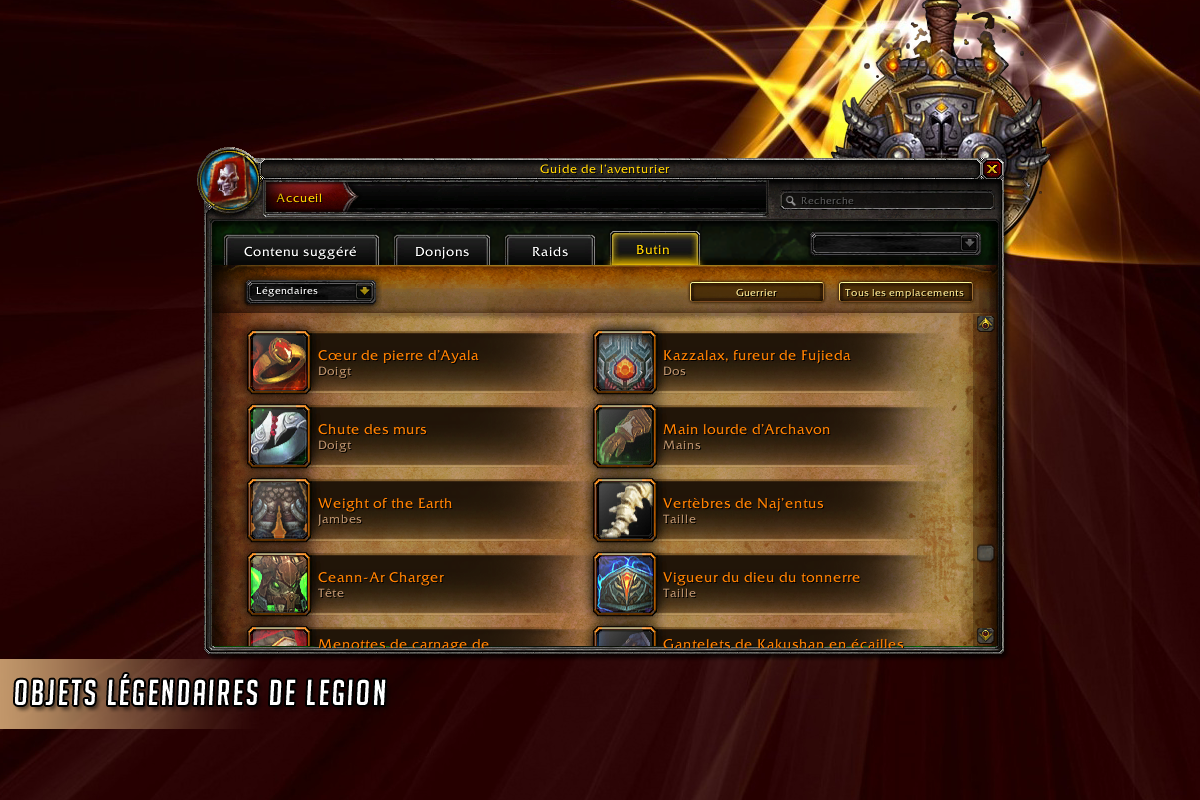 Dans l'extension de Legion, le guide de l'aventurier se met à jour avec un nouvel onglet : "Butin" qui recense tous les 160 objets légendaires de chacune des classes/spécialisations par des filtres identiques aux butins de raids et donjons, ainsi que les ensembles d'armures de l'extension en cours avec le T19 & l'ensemble du domaine de classe. Les objets légendaires sont très puissants (mais moins que ceux qui étaient disponibles avant comme l'anneau ou la cape de Mists of Pandaria), puisqu'en plus d'un niveau d'objet équivalent au mode mythique du Cauchemar d'Émeraude en 895 avec des statistiques élevées, ils disposent d'effets passifs importants qui vont compléter votre équipement. Néanmoins, ils seront très difficiles à obtenir, ils se récupèrent via une faible chance sur les monstres des Îles brisées, les coffres d'expéditions ou même via le mode mythique+ et plein d'autres moyens... Cependant, ces légendaires liés quand ramassés ne peuvent pas être vendus ou échangés et auront une restriction importante à propos de leurs utilisations pour éviter que les joueurs chanceux n'aient un avantage trop important.