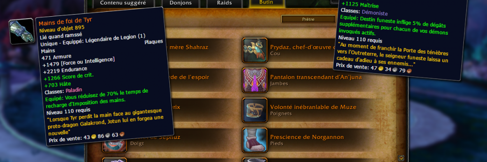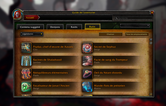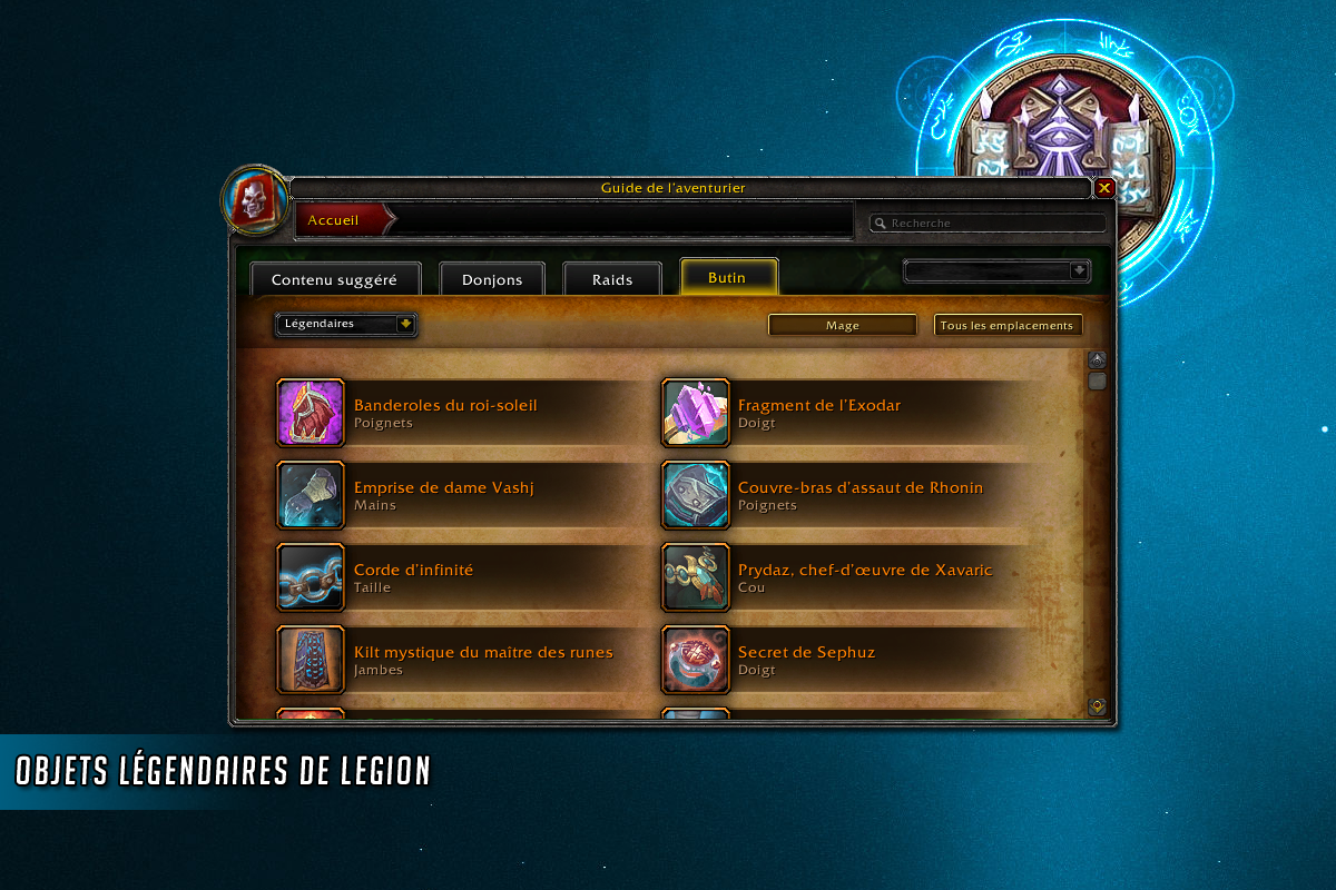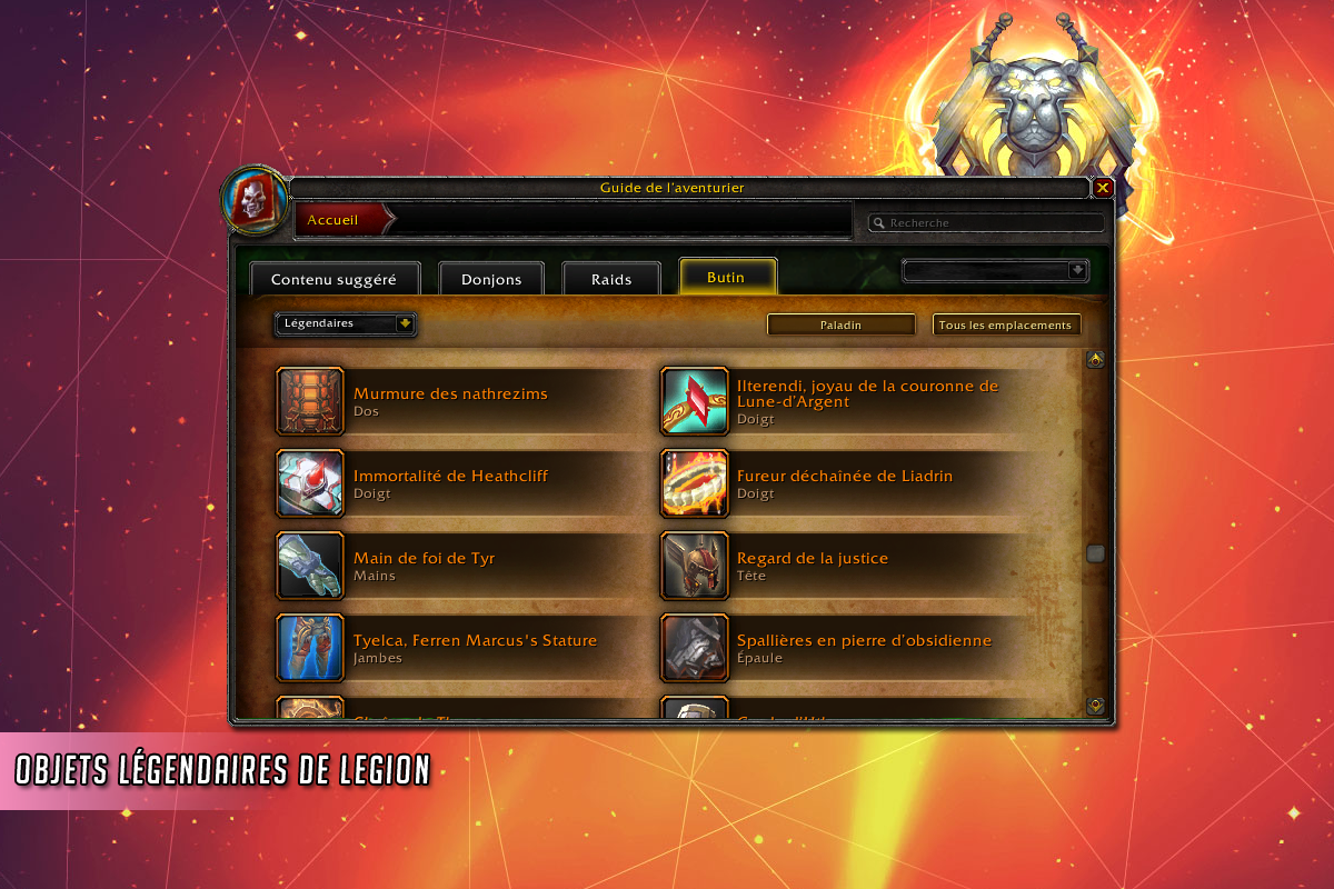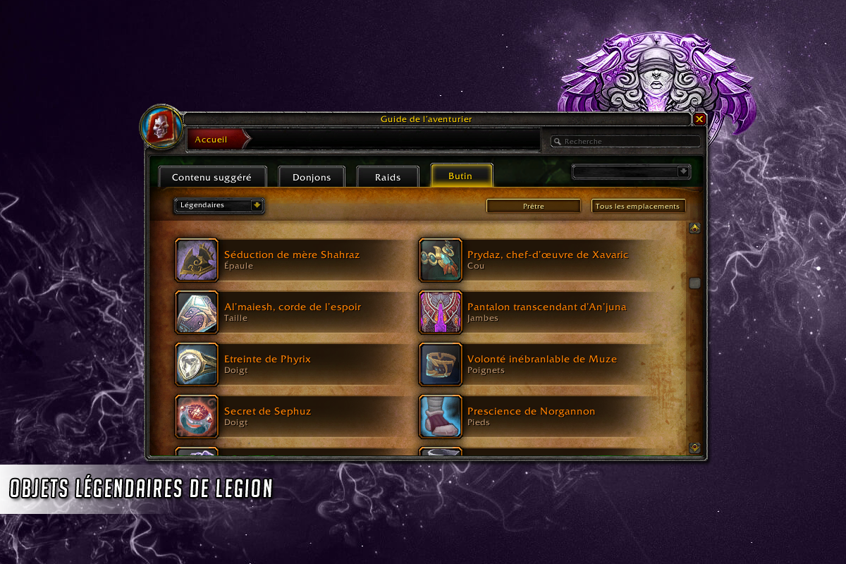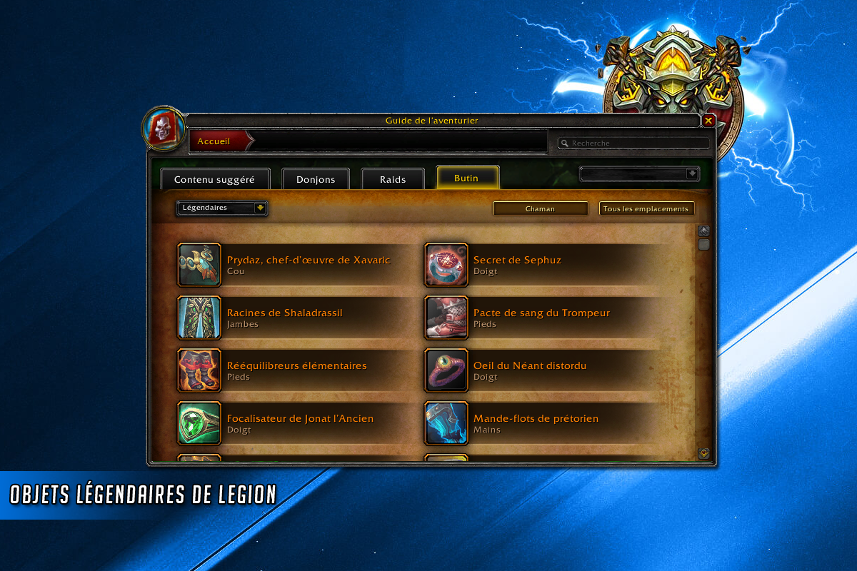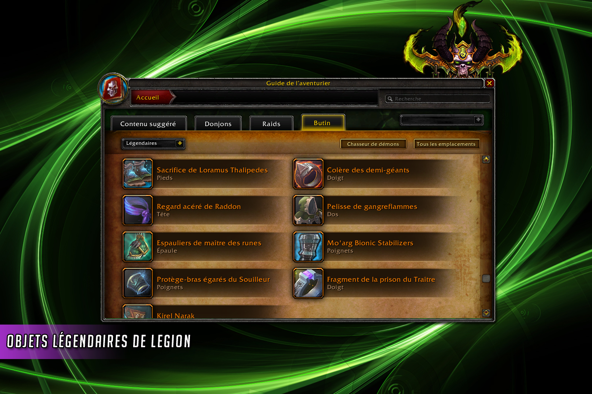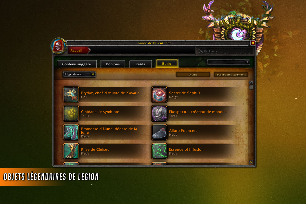 Dans l'extension de Legion, le guide de l'aventurier se met à jour avec un nouvel onglet : "Butin" qui recense tous les 160 objets légendaires de chacune des classes/spécialisations par des filtres identiques aux butins de raids et donjons, ainsi que les ensembles d'armures de l'extension en cours avec le T19 & l'ensemble du domaine de classe. Les objets légendaires sont très puissants (mais moins que ceux qui étaient disponibles avant comme l'anneau ou la cape de Mists of Pandaria), puisqu'en plus d'un niveau d'objet équivalent au mode mythique du Cauchemar d'Émeraude en 895 avec des statistiques élevées, ils disposent d'effets passifs importants qui vont compléter votre équipement. Néanmoins, ils seront très difficiles à obtenir, ils se récupèrent via une faible chance sur les monstres des Îles brisées, les coffres d'expéditions ou même via le mode mythique+ et plein d'autres moyens... Cependant, ces légendaires liés quand ramassés ne peuvent pas être vendus ou échangés et auront une restriction importante à propos de leurs utilisations pour éviter que les joueurs chanceux n'aient un avantage trop important.
