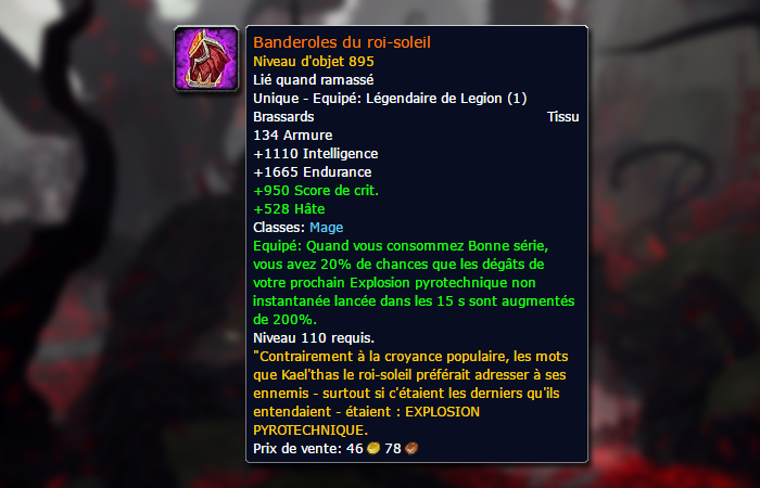 Le mage dispose d'une liste de 14 objets légendaires dont l'un d'entre eux (voir deux selon le talent du domaine de classe) pourra être équipé pendant une longue période jusqu'à ce que Blizzard débloque la limite instaurée au fur et à mesure de l'extension. Pour rappel, ces légendaires ont un faible pourcentage de drop dans tous les Îles brisées via les activités, les monstres, le mode mythique+ (et autres) ont tous un niveau d'objet 895 et un effet passif qui vise à transformer votre gameplay.