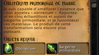 Sadeen, sur le Vindicaar (ou à proximité de la forge à Oblitérium de Dalaran), est capable d'améliorer votre oblitérium pour fusionner un échantillon de ce dernier avec une sargerite primordiale afin de récupérer un exemplaire d'