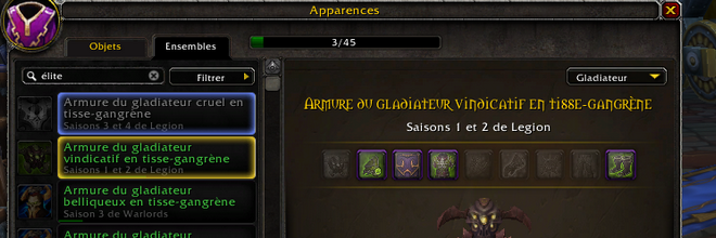 Avec le déploiement de la mise à jour 7.2, l'interface des apparences de Legion est améliorée puisqu'il dissocie désormais tous les ensembles d'armures JcJ et JcE relatifs à la classe, grâce à l'ajout d'un onglet Ensembles dans la fenêtre dédiée. Cet onglet, disponible directement dans les apparences, recense les ensembles d'armures avec un champ de recherche, de filtres pour trier, et d'une progression générale avec des hauts-faits. La plupart des ensembles d'armures JcJ disparus des extensions de Burning Crusade et Wrath of the Lich King sont à nouveau disponible aux vendeurs à Raz-du-Néant et Dalaran (Norfendre).