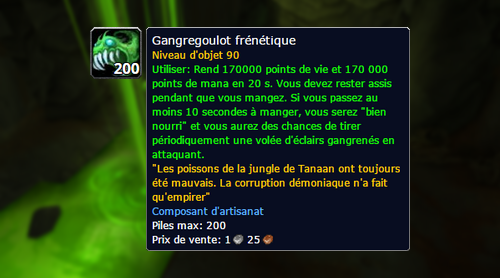 Gangregoulot frénétique. Mais, lorsque vous le consommerez, au lieu d'avoir une simple amélioration sur vos statistiques, celui-ci permet d'avoir des chances de tirer périodiquement une volée d'éclairs gangrenés ! Outre le fait que la pêche permet de récupérer le nouveau composant :