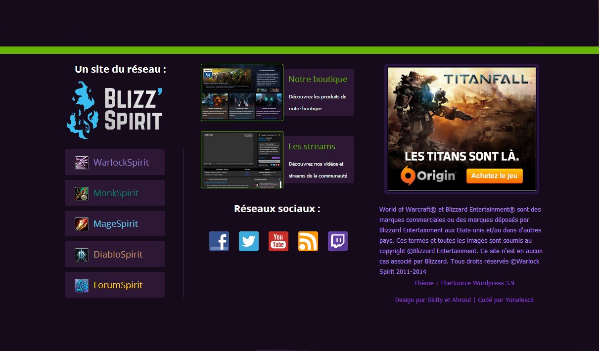 Depuis le 18 Février dernier, la nouvelle plateforme de notre réseau a vu le jour : BlizzSpirit dont celle-ci a pour but d'avoir une plateforme commune à nos activités. De longues semaines de développements ont été mises en oeuvre pour tenter de créer un point clef de notre réseau, c'est à dire que si vous jouez Moine, Démoniste ET Mage (où n'importe quelle autre classe à l'avenir), BlizzSpirit avait l'objectif de pouvoir consulter l'actualité très rapidement et de vous rediriger sur le site concerné au lieu de devoir consulter plusieurs sites pour chacune des classes. Cependant, le lancement n'était pas à la hauteur de nos espérances à cause de divers bugs repérés au sein de la structure et ces problèmes nuisaient à notre objectif principal. A l'heure actuelle, ces problèmes sont résolus grâce à l'aide de la communauté, on pense notamment à Xamoü, Lockout, Ganøndø ainsi que le boulot de notre administrateur réseau Démencia pour leurs aides précieuses.