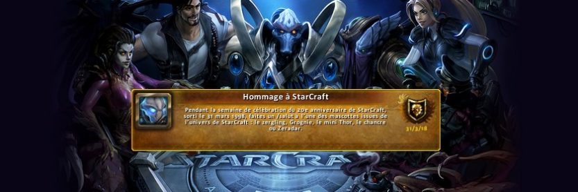 Pour célébrer les 20 ans de la licence Starcraft, un tour de force spécial est disponible dans World of Warcraft jusqu'au 6 avril. Le tour de force « Hommage à StarCraft » est unique puisque les joueurs peuvent l'obtenir pendant une durée limitée du 31 mars au 6 avril 2018, saluez l’une des mascottes issues de StarCraft (Zergling, Grognie, Mini Thor, Chancre ou Zeradar) pour être éligible. Ce tour de force ne possède aucune récompense associée mais c'est toujours agréable de compléter la collection. N'oubliez pas également que plusieurs autres récompenses peuvent être obtenues sur les autres licences de Blizzard comme le modèle Sarah Kerrigan sur Overwatch ou des portraits sur Heroes of the storm.