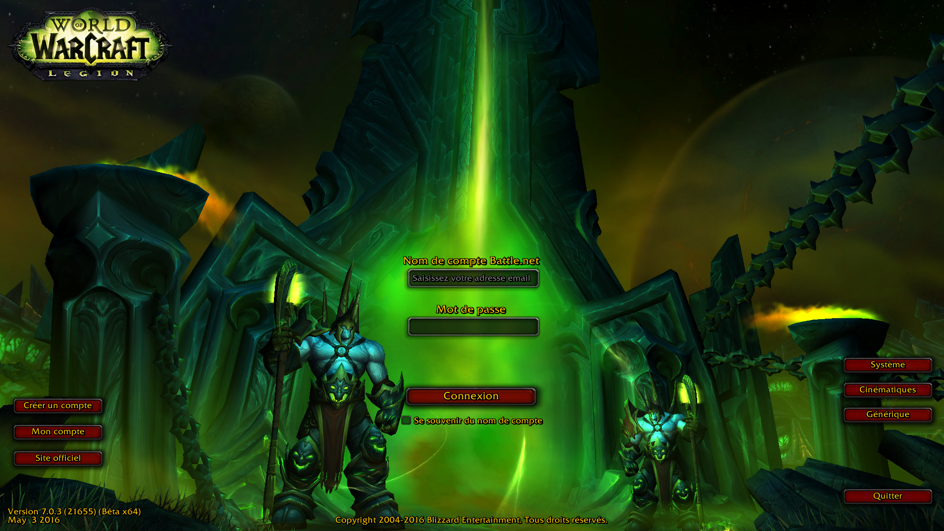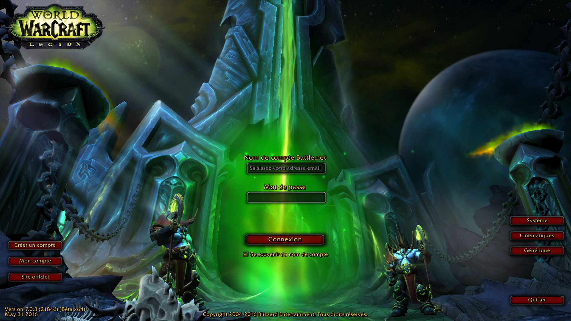 - Mise à jour 02/06 : Le client 21846 de Legion apporte un nouvel écran de connexion et sa musique.