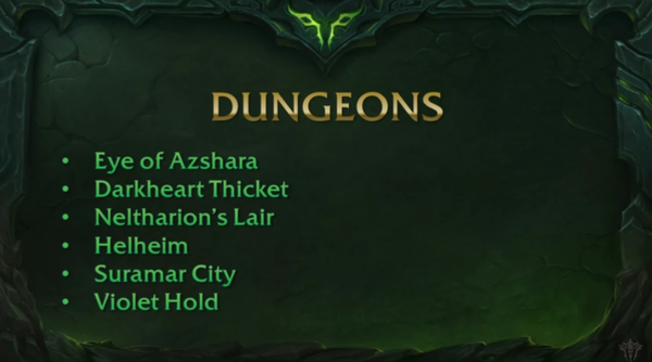 En terme de donjons et raids, la conférence de la Gamescom a été riche puisque qu'une partie importante nous est révélée avec l'aperçu des prochains donjons et raids. Neufs nouveaux donjons sont révélés pour la sortie de Legion dont Blizzard nous confirme qu'il y'aura davantage de donjons qu'auparavant avec les donjons suivants :