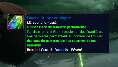 Les faveurs listées ci-dessous ne procurent que des avantages pour récupérer des composants de métiers au lieu de donner un bonus aux statistiques comme à l'époque de Wrath of the Lich king. Les sacoches récupérées sur les cadavres sont relativement rares et permettent surtout de récupérer quelques composants en fonction de la faveur utilisée sur vos épaulières qui serviront pour vos métiers. Chacune des faveurs s'achètent à des intendants de réputations (disponibles dans notre guide) contre quelques