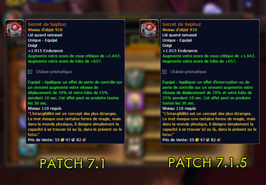 Secret de Sephuz fonctionne aussi sur les effets d'interruption ou dissipation pour un bonus de 25% hâte (au lieu de 15%).
