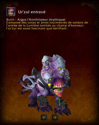 La nouvelle monture de la mise à jour 7.3 : Ur'zul entravé, aussi fascinante qu'effrayante, est un assemblage de corps et d'âmes torturées des soldats déchus de l'armée de la Lumière tombés au champ d'honneur. Cette monture se récupère avec 100% d'obtention sur Argus l'Annihilateur : le boss final d'Antorus, le trône ardent en mode mythique. Lorsque la prochaine extension sera déployée, le taux d'obtention sera probablement réduit à 1 à 3% sur Argus. Notez qu'il existe plusieurs variations de couleurs non-utilisées pour cette monture.