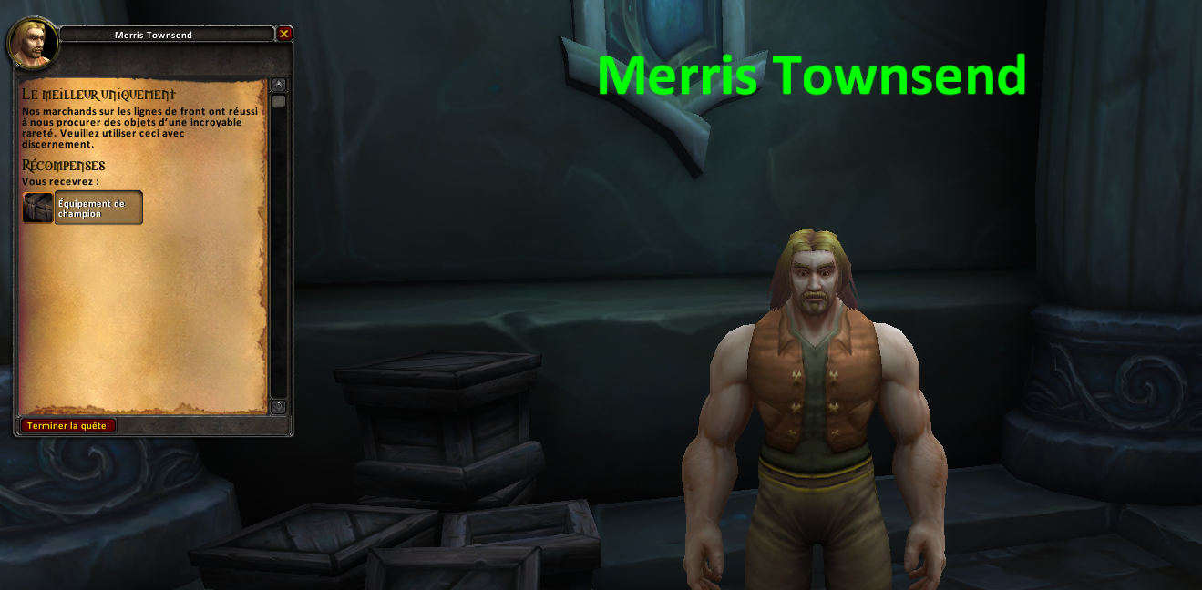 Champions valeureux, le PNJ Merris Townsend dans le bâtiment de la base stratégique permet de donner une caisse d'équipement de champion qui contient un légendaire aléatoire.