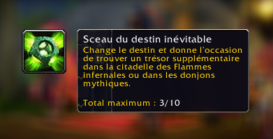 Ces nouveaux sceaux du destin inévitable fonctionnent pour tous les boss de la citadelle des Flammes infernales, dans les donjons en mode mythique et le boss mondial en extérieur le Seigneur suprême Kazzak, et s'achètent de la même manière pour les