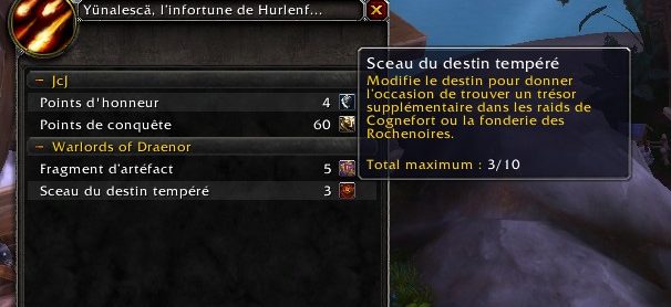 Sceau du destin tempéré d'un des quatre moyens d'acquisition, son coût sera doublée pour le prochain sceau mais seulement à la quête préalablement choisie. Ainsi, un joueur pourra débourser 500 pièces d'or, 500 points d'honneur et 200 ressources du fiefs pour avoir ses trois sceaux de la semaine où débourser directement 3 500 pièces d'or au total pour ses trois sceaux.