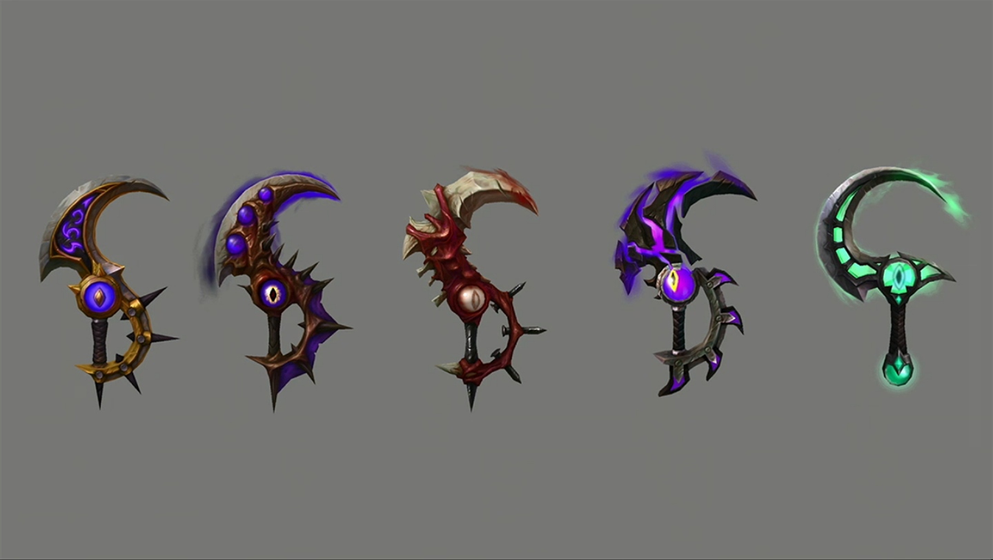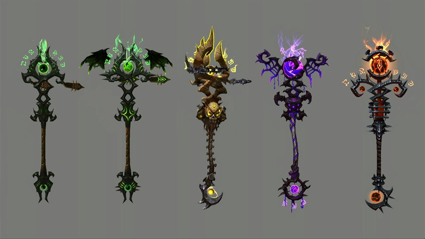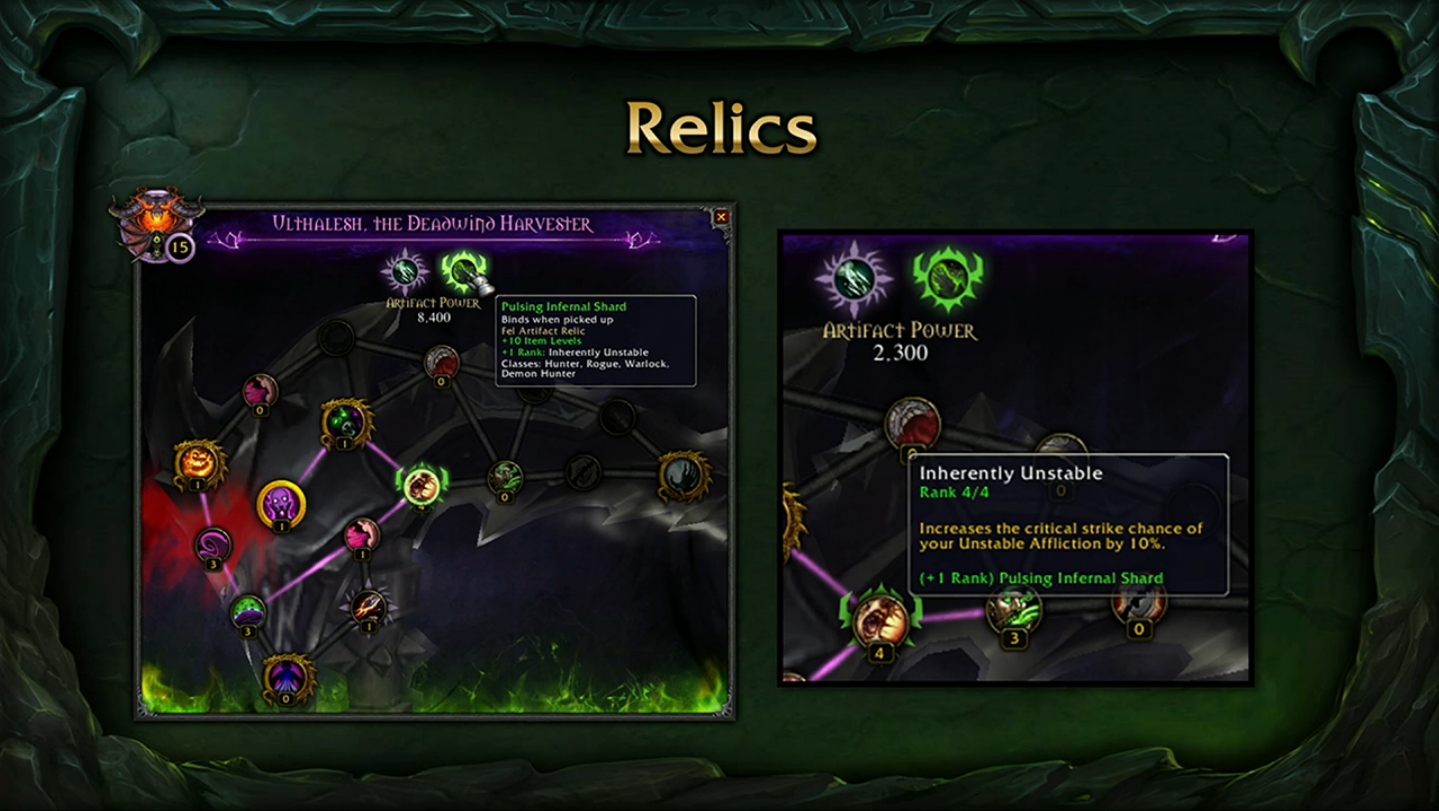 Parmi les nombreuses armes prodigieuses qui vont faire leur apparition dans Legion, la faux pour démoniste Affliction baptisée faux de Deuillevent représente parfaitement la manière dont fonctionnent les armes prodigieuses : vos armes engrangent de la puissance prodigieuse et possèdent un véritable arbre de traits prodigieux à débloquer grâce à cette ressource. Ces traits comportent plusieurs rangs, ce qui permet à votre personnage de poursuivre sa progression au-delà du niveau 110. Un nouveau type d’objet, les reliques, sera également ajouté. Ces reliques s’insèrent dans les armes prodigieuses pour augmenter leur niveau d’objet et améliorer les rangs de différents traits. De plus, chaque arme se décline en plusieurs modèles et couleurs, ce qui confère une incroyable diversité au système.