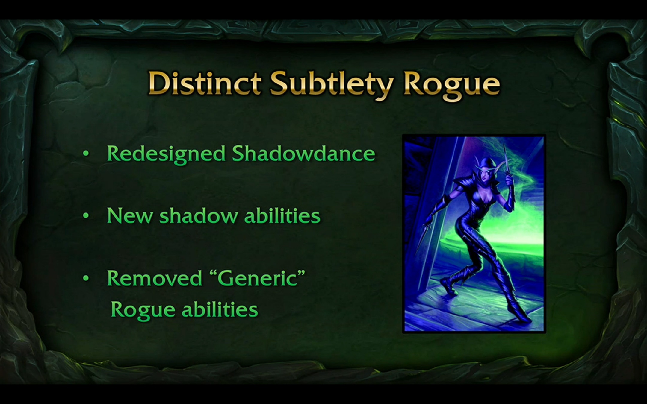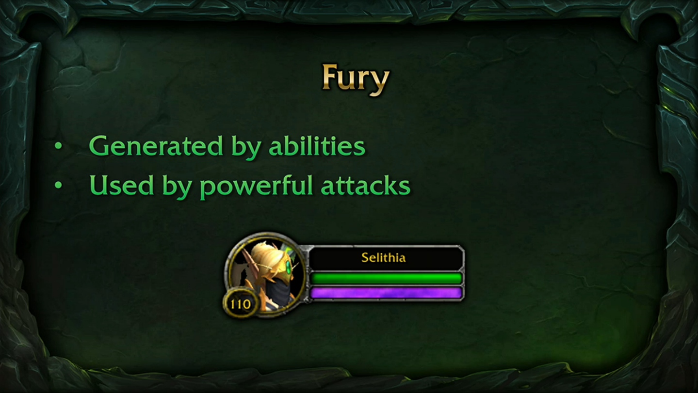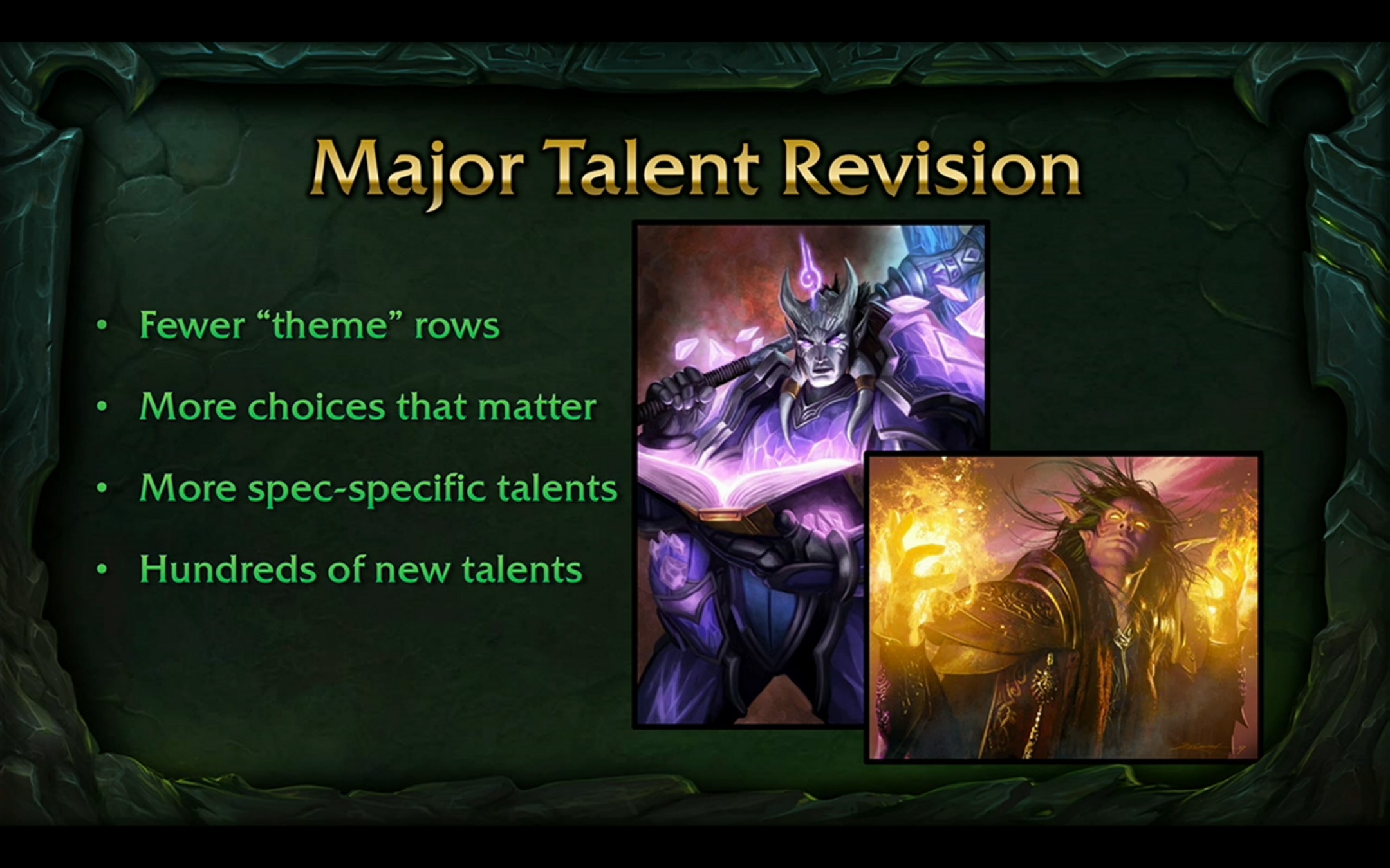 Comme Legion apporte de nombreuses modifications aux classes, l’équipe de développement en a profité pour revoir chaque spécialisation avec une question bien précise en tête : quels éléments rendent une classe unique ? Dans Legion, nous avons pour objectif de différencier les spécialisations de sorte que les chevaliers de la mort, les guerriers Fureur ou les mages Arcanes se démarquent des autres membres de leur classe. Certaines spécialisations, comme les chasseurs Survie, les prêtres Discipline et les voleurs Finesse, ressemblent un peu trop aux autres spécialisations de leur classe ; nous voulons donc renforcer leur identité. Cela passe par une immersion plus poussée, pour les prêtres Ombre, les démonistes Démonologie et les druides Gardien par exemple, ainsi que par une amélioration des spécialisations perçues comme trop faibles, comme les mages Arcanes, les guerriers Fureur et les chevaliers de la mort. Cette refonte majeure se concentre sur des talents plus spécifiques à leur spécialisation et permet aux joueurs de faire des choix plus significatifs.