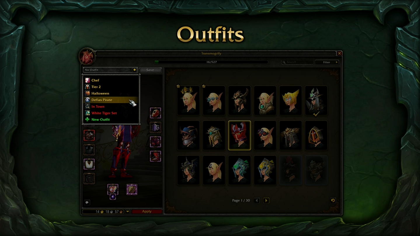 World of Warcraft : Legion va apporter une nouvelle fonctionnalité enrichissante avec la Garde-robe pour libérer davantage de place dans votre inventaire et chambre du vide. Une nouvelle interface de collection va permettre de récolter tous les objets de World of Warcraft : lorsque vous équipez un objet, son apparence est débloquée dans notre garde-robe comme pour les héritages actuellement dont vous pourrez ensuite le vendre où le détruire, le système de transmogrification 2.0 fonctionne de la même manière que Diablo. Néanmoins, si vous êtes en train de pleurer d'avoir détruits plusieurs objets de quêtes : rassurez-vous puisque le système est RETROACTIF, tous les objets récoltés au sein de votre aventure sur WoW seront automatiquement intégrés à cette fonctionnalité ainsi que les objets de quêtes à choix multiple dans la pré-mise à jour de Legion.