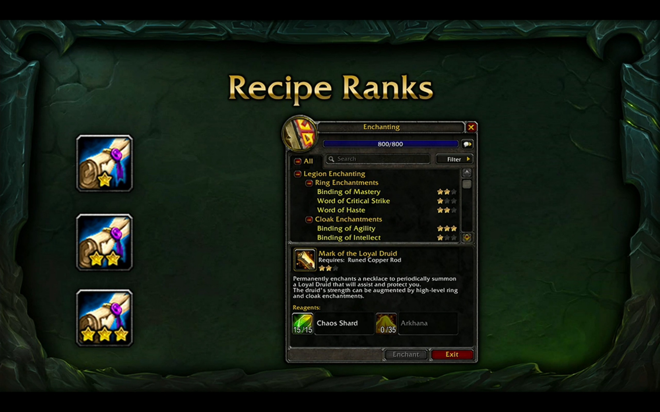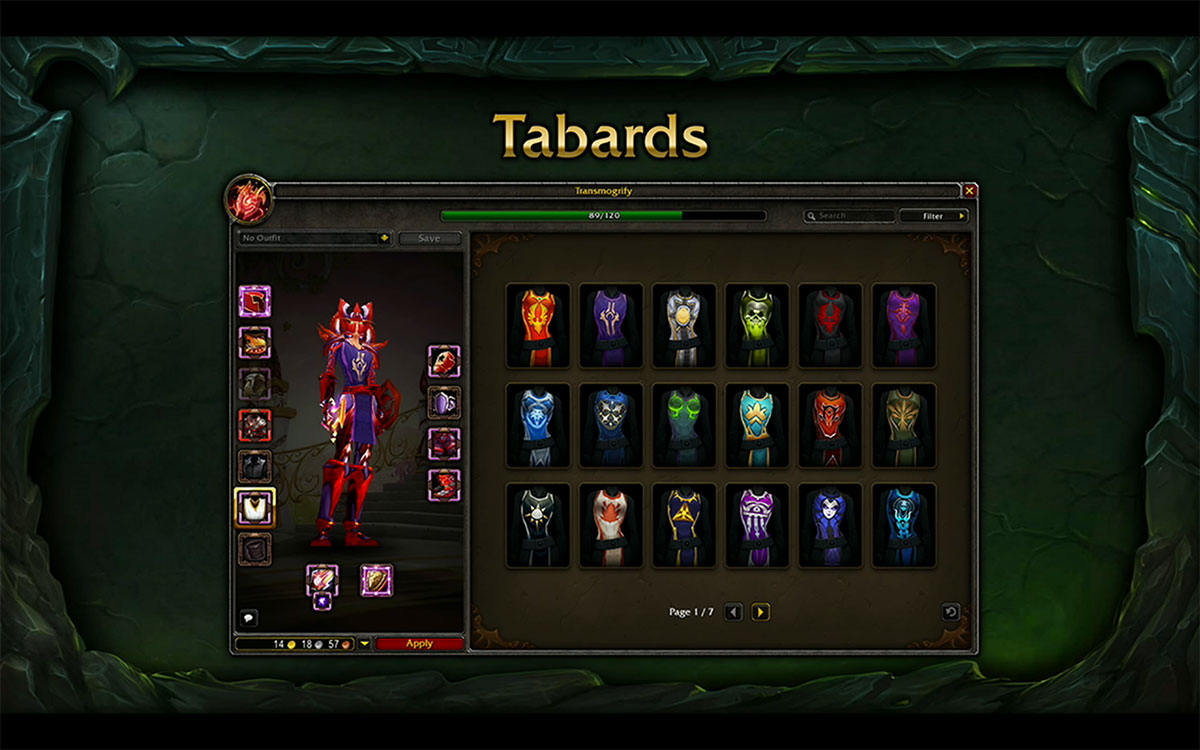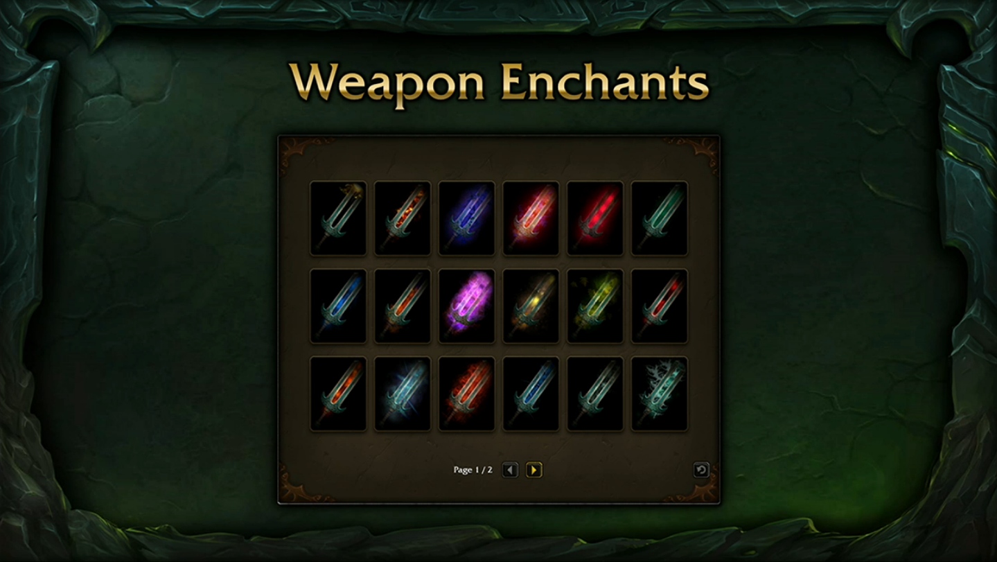 Pour libérer davantage d'espace dans votre inventaire, trois nouvelles interfaces de collection vont réunir tous les enchantements d'armes (plus besoin d'un PNJ au cabinet d'enchantement au fief), des tabards ainsi que des chemises. De la même manière que la garde-robe, les objets réunis au cours de votre aventure sur World of Warcraft seront rétro-actif.
