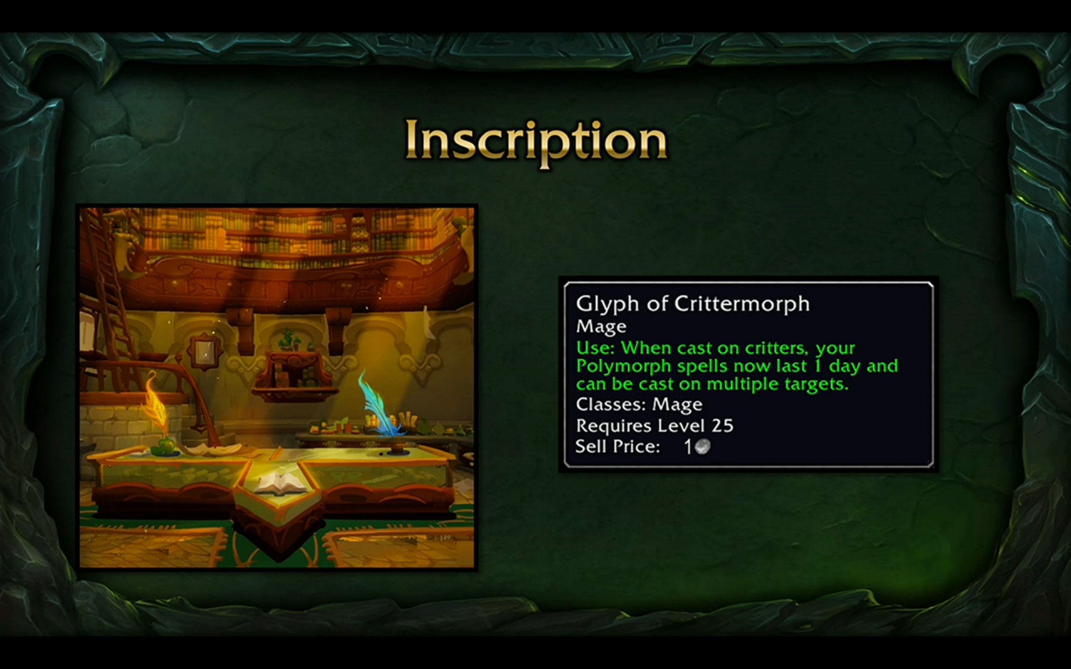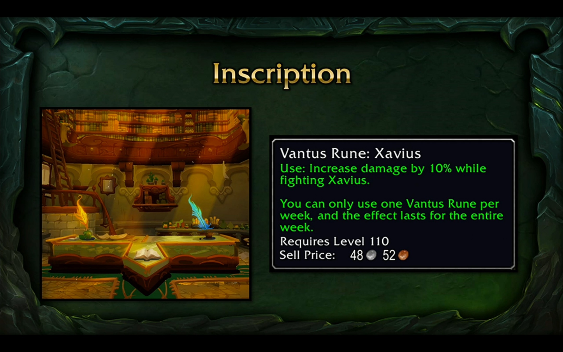Les calligraphes auront une refonte importante dans Legion puisque les glyphes majeurs sont supprimés du jeu, tandis que les glyphes mineurs deviennent des consommables qui s'appliquent directement aux sorts de votre grimoire. Cependant, si un glyphe d'un effet différent vise à modifier une même technique : vous ne pourrez pas avoir les deux effets simultanés mais tous les sorts peuvent avoir l'effet d'un glyphe mineur. Afin de rentabiliser votre métier, les calligraphes seront en mesure de confectionner des nouvelles suites de sombrelune, des glyphes mineurs ainsi que des runes de Vantus. Ces runes seront obligatoires pour les joueurs qui font des raids puisque chaque semaine : la rune de Vantus dispose d'une amélioration de dégâts contre un boss particulier : 10% de dégâts sur Xavius par exemple.