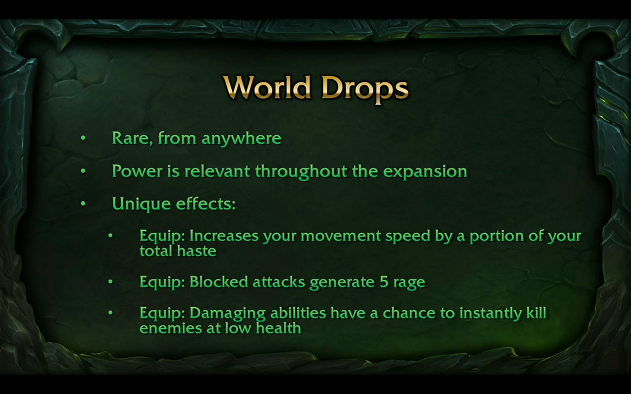 Les World drop vont faire un retour sur le jeu et seront notamment des objets qui disposent d'un effet unique, mais ils sont désormais legion-dary (légendaire). Cependant, par définir, le world drop est un objet hyper rare avec un taux de drop de moins de 0,1% sur tous les monstres du continent, mais pour éviter la frustration de l'aléatoire : d'autres moyens seront proposés afin d'augmenter vos chances de succès en ciblant particulièrement un objet légendaire. Voici quelques effets pour les objets légendaires de Legion :
