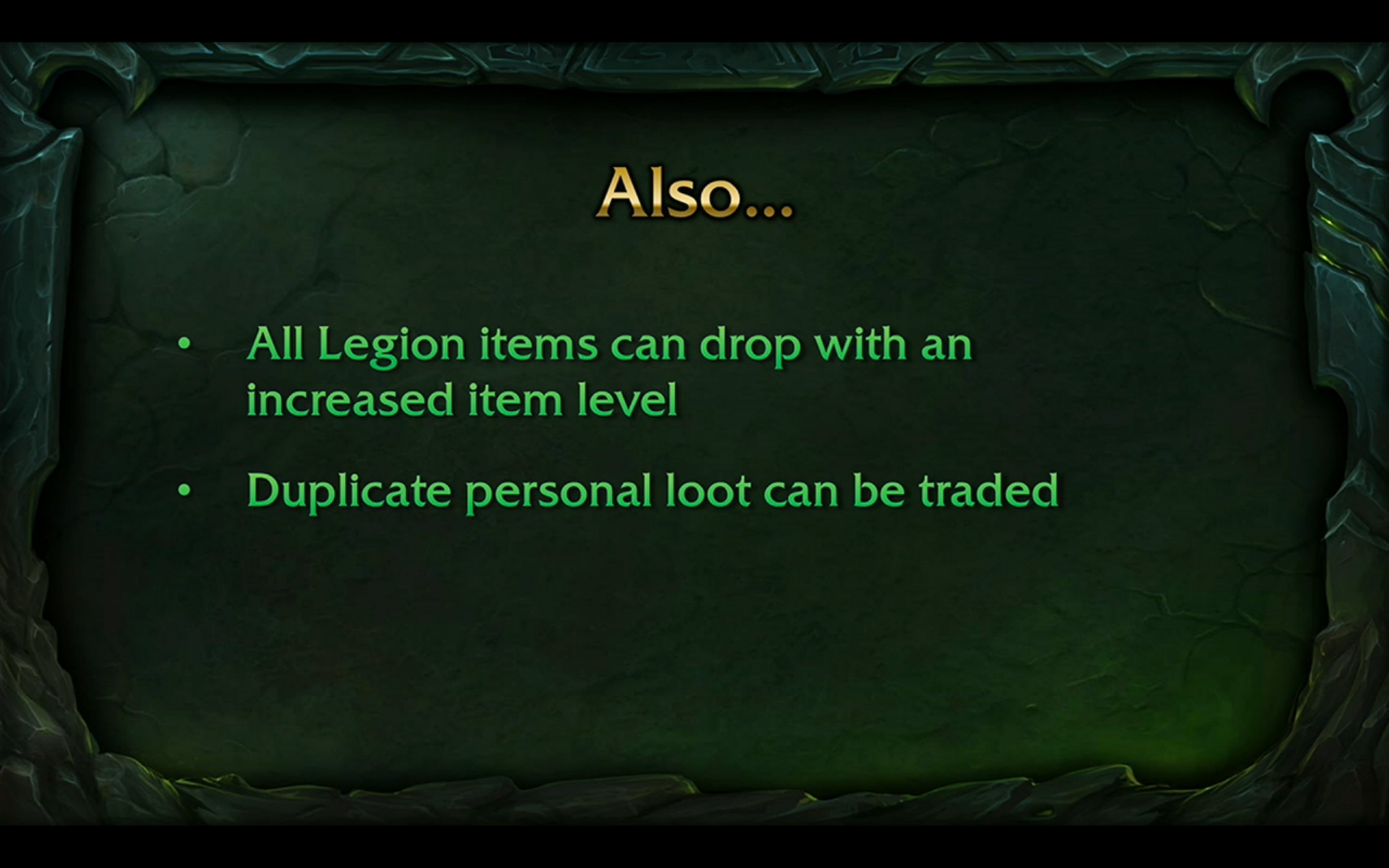 Pour finir, chacun des objets de Legion peuvent être récupérés avec une augmentation de son niveau d'objet, un peu comme le fortin nain de Warlords of Draenor, dont ce système est formalisé et généralisé. Et pour faciliter votre progression, tous les objets personnels en double récupérés lors d'une défaite d'un boss pourront être échangés.